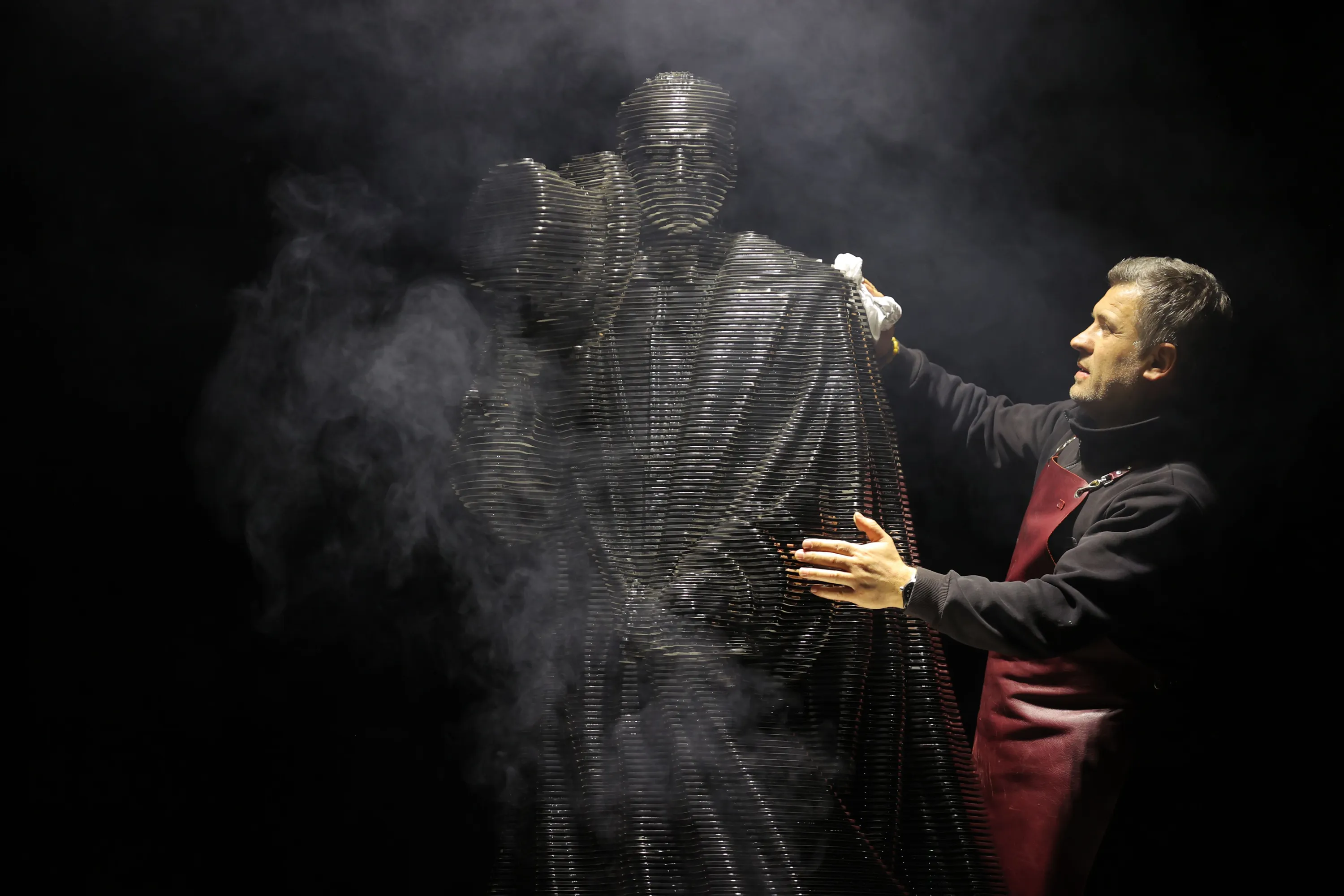 Ridvan Sevim, owner of a metal workshop, works on steel statue of Turkish Republic's Founder Mustafa Kemal Ataturk in Bursa, Turkey on November 18, 2021. After 6 months of efforts Sevim managed to complete the 1.9 meter tall and 1700 kgs steel statue of Turkish Republic's Founder Mustafa Kemal Ataturk wearing a black cape and holding a top hat. (Photo by Ali Atmaca/Anadolu Agency via Getty Images)