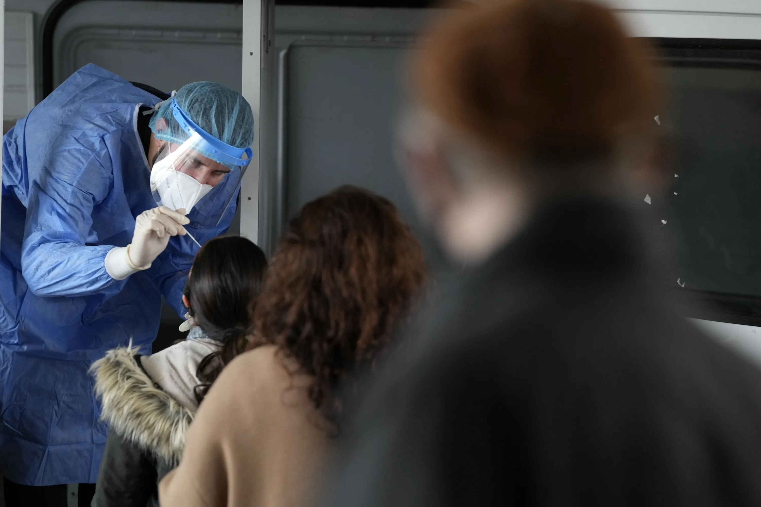 A member of the medical staff at the National Public Health Organisation (EODY) conducts a COVID-19 rapid test on a woman in Athens, Greece, Wednesday, December 29, 2021. A government committee of medical experts hold an emergency meeting Wednesday to consider speeding up scheduled restrictions after the daily number of COVID-19 infections more than doubled in a day to set a new record. (Photo by Thanassis Stavrakis/AP Photo)