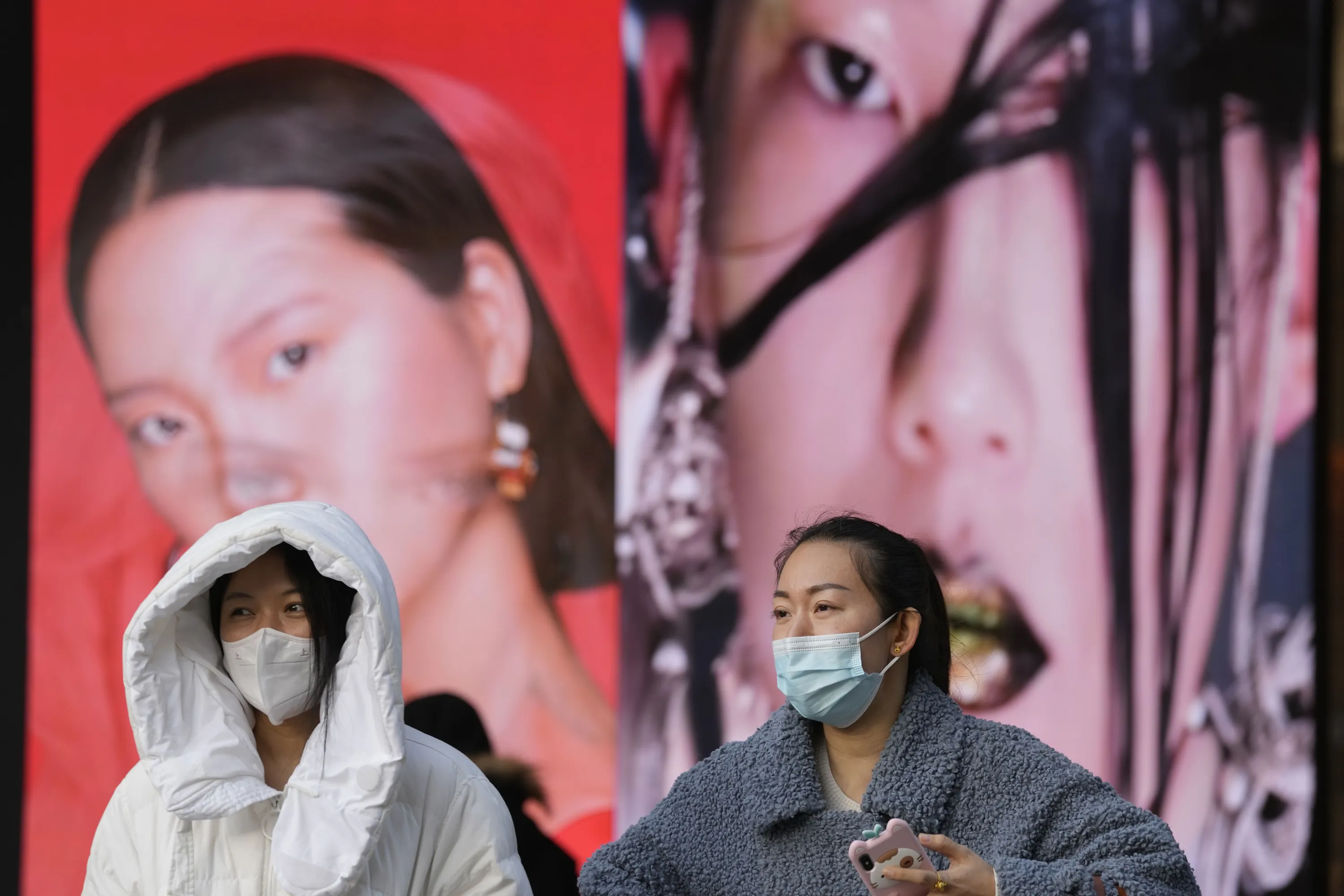 Women wearing masks walk past ads featuring models for make up products in Beijing, China, Tuesday, December 28, 2021. Advertisements featuring some Chinese models have sparked feuding in China over whether their appearance and makeup are perpetuating harmful stereotypes of Asians. (Photo by Ng Han Guan/AP Photo)