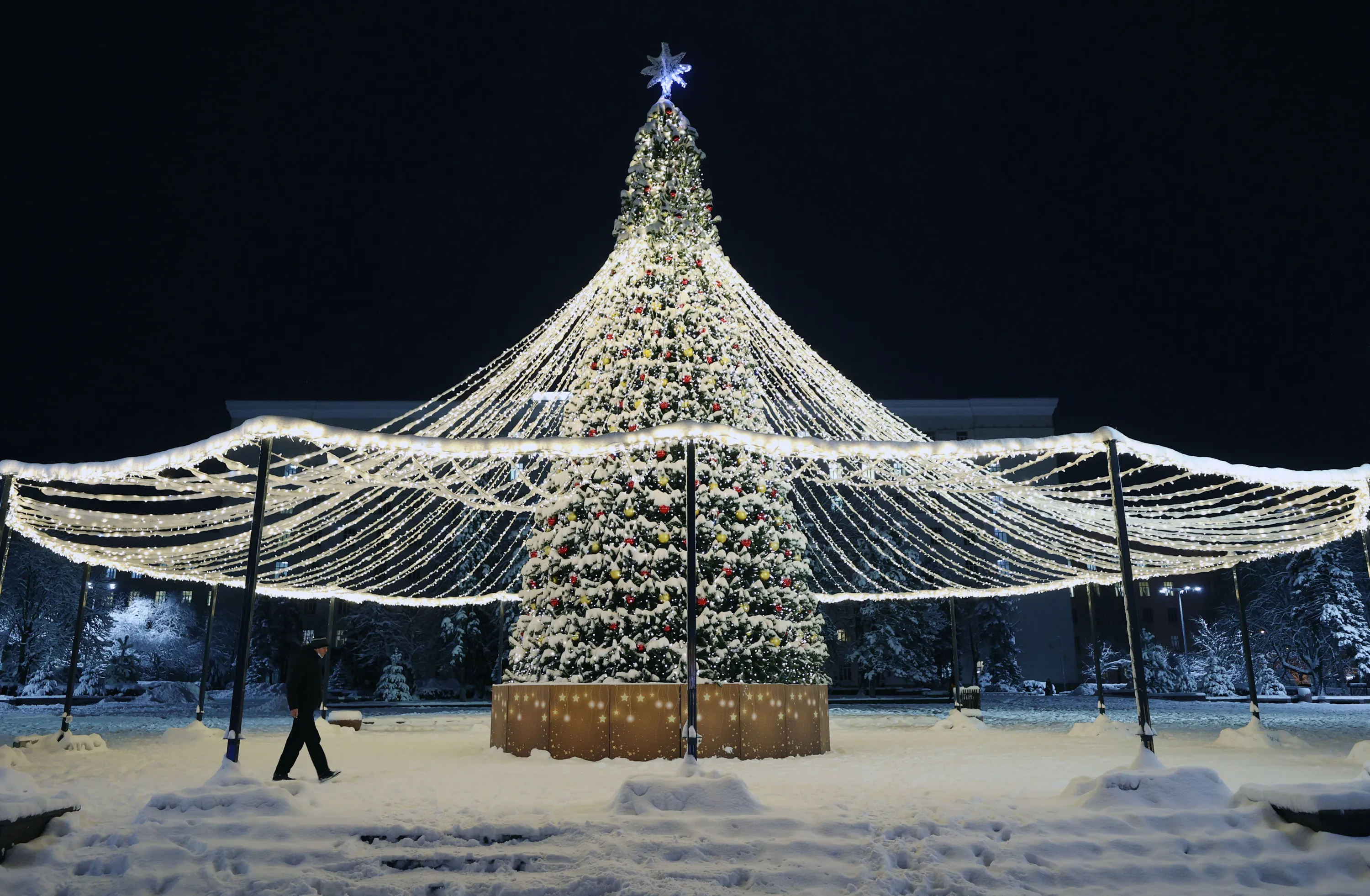 A Christmas tree stands in Soviets Square in Rostov-on-Don, Russia on December 27, 2021. (Photo by Erik Romanenko/TASS)