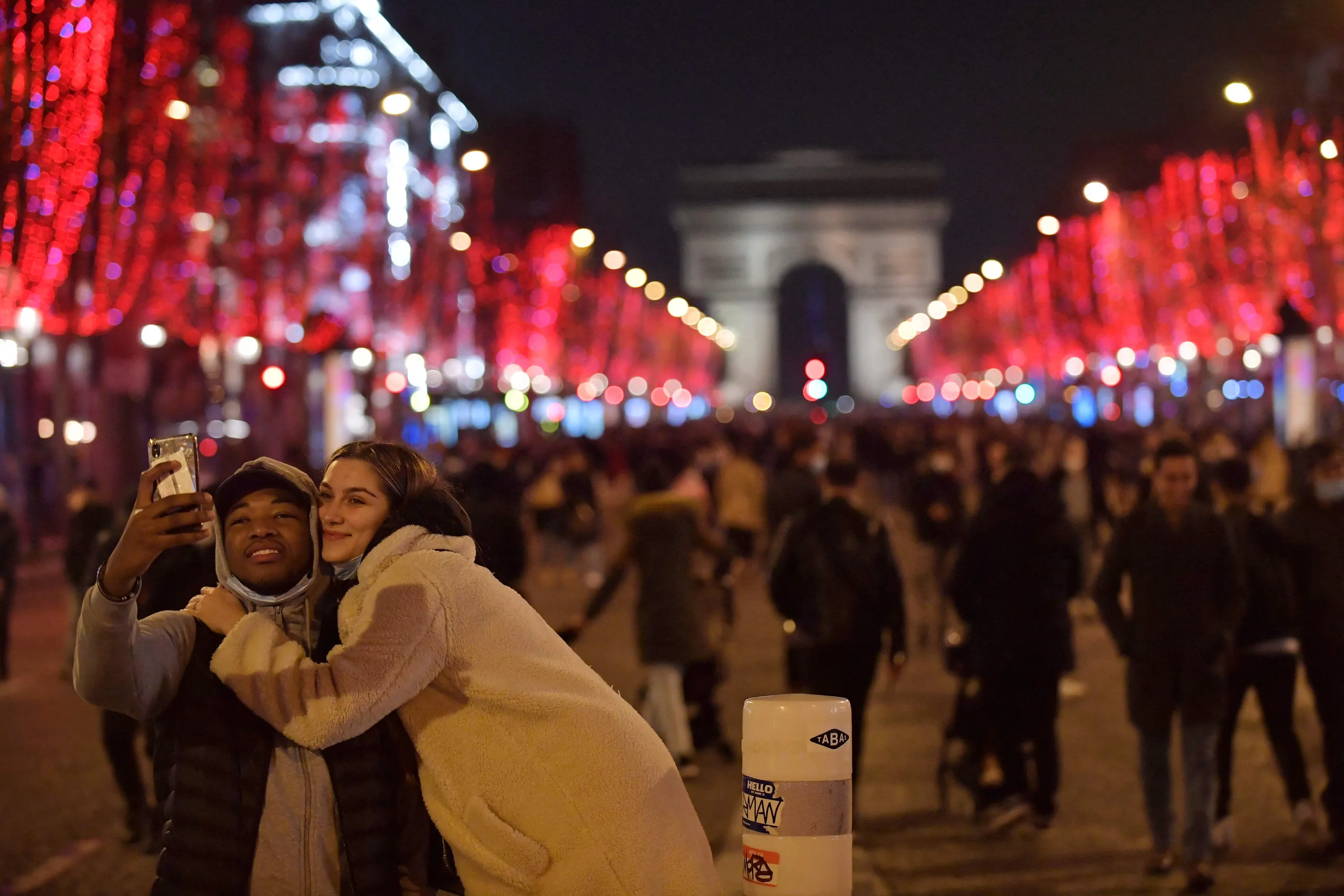 A couple takes a selfie picture along the Champs-Elysees Avenue on New Year's Eve, on December 31 2021. Since December 31, 2021, the protective face mask is mandatory for pedestrians in Paris and other cities to prevent the spread of the Covid-19 (coronavirus) pandemic. (Photo by Julien de Rosa/AFP Photo)
