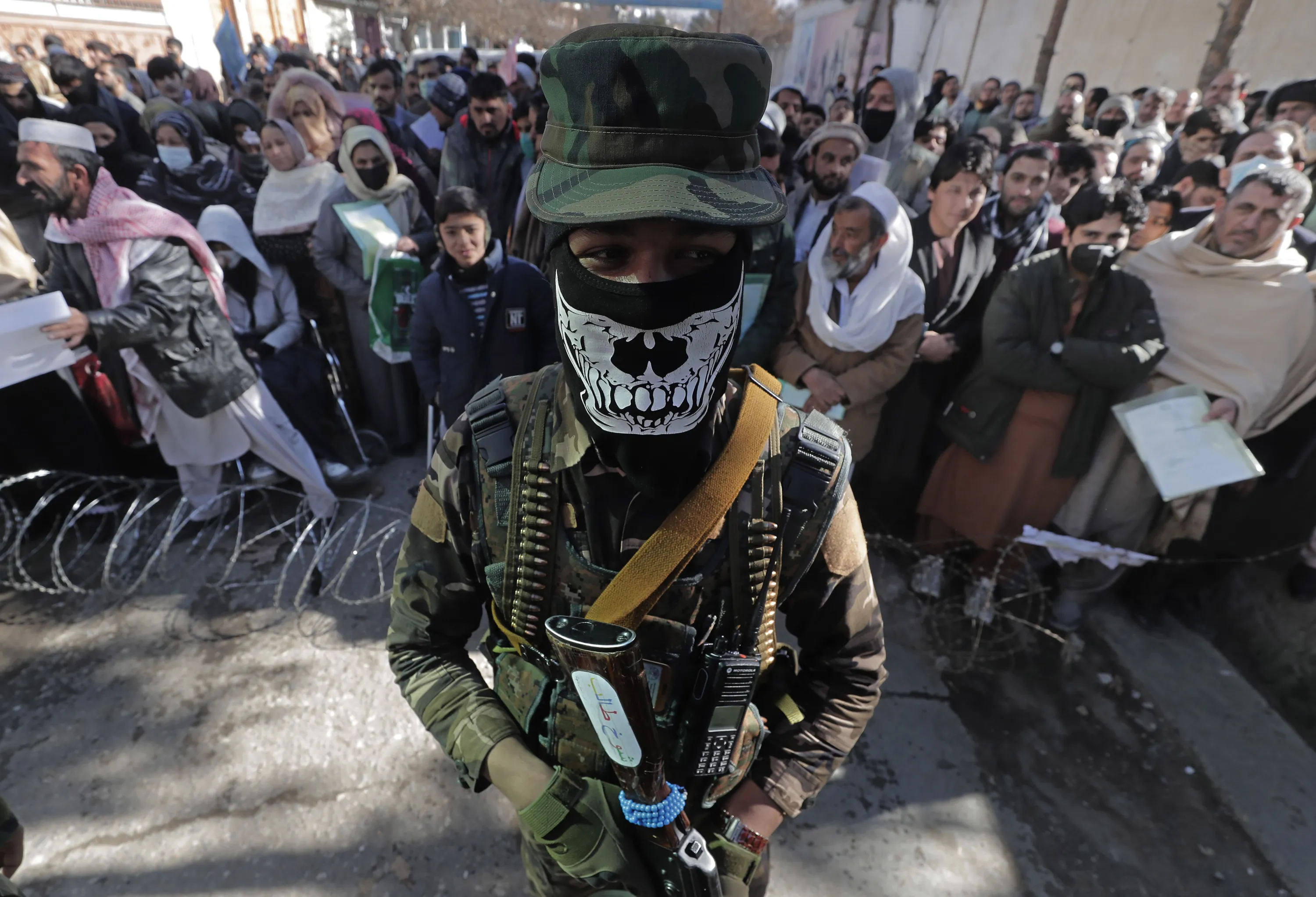 Taliban stand guard as people wait to enter the passport office following its reopening after a grap of one month in Kabul, Afghanistan, 18 December 2021. Passport Director Alam Gul Haqqani said on 18 December that passport issuing services, which were closed for one month due to overcrowding and technical problems with biometric devices, have resumed. The department currently handles around 3,000 passports a day in provincial offices. Since August, the entire country has been under the control of the Taliban, whose earlier government (1996-2001) was marked by a strict interpretation of Islamic Law (Sharia), human rights violations and the exodus of a large number of citizens. (Photo by Maxim Shipenkov/EPA/EFE)
