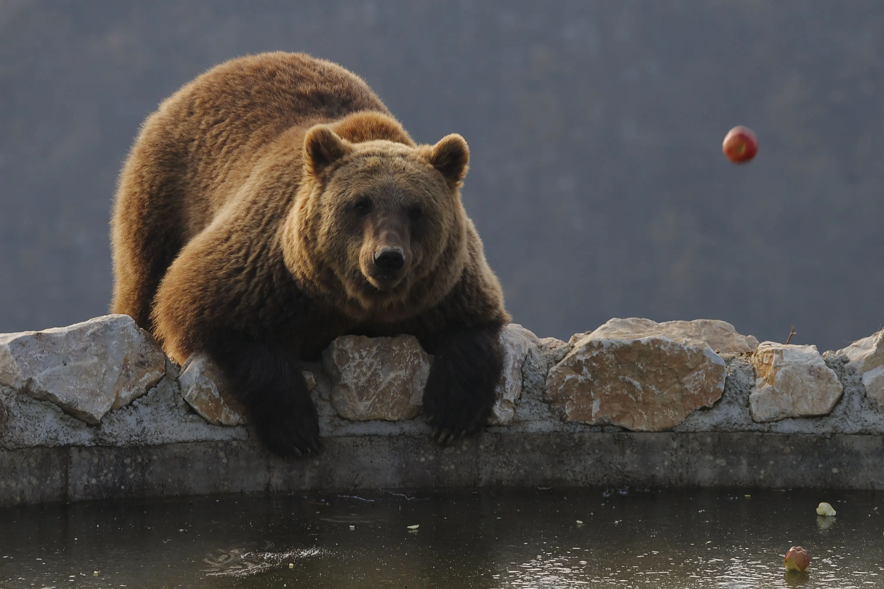 A brown bear looks on for apples in a bear sanctuary near the village of Mramor, Kosovo, 22 December 2021. The Bear Sanctuary Pristina has rescued bears from private restaurants around Kosovo and Albania. All privately kept brown bears lived in small cages at restaurants. They were born mostly in the forests of Kosovo or Albania and snatched from their mothers by animal dealers. (Photo by Valdrin Xhemaj/EPA/EFE)
