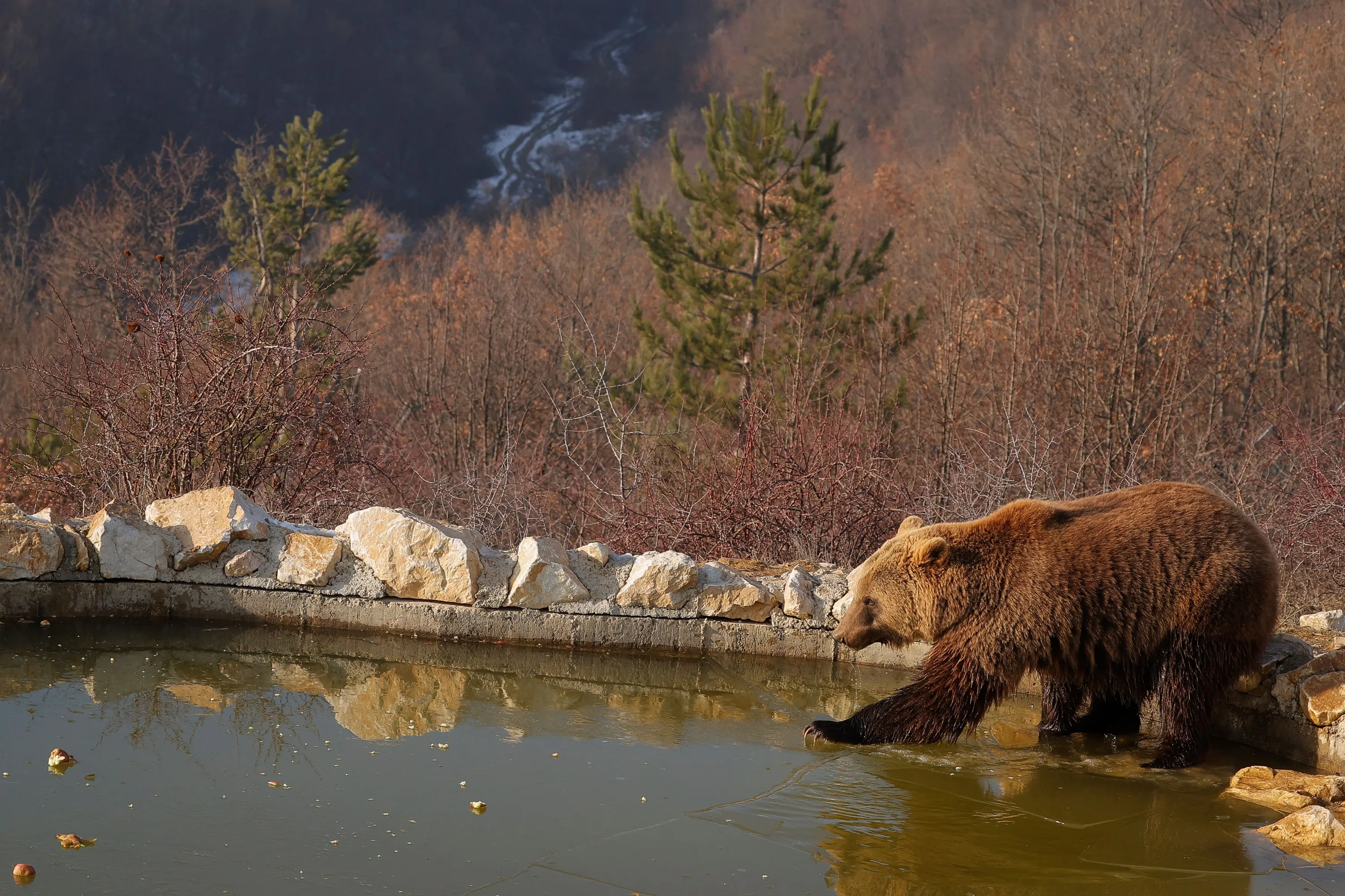 A brown bear catches apples from the iced surface of a little pond in a bear sanctuary near the village of Mramor, Kosovo, 22 December 2021. (Photo by Valdrin Xhemaj/EPA/EFE)