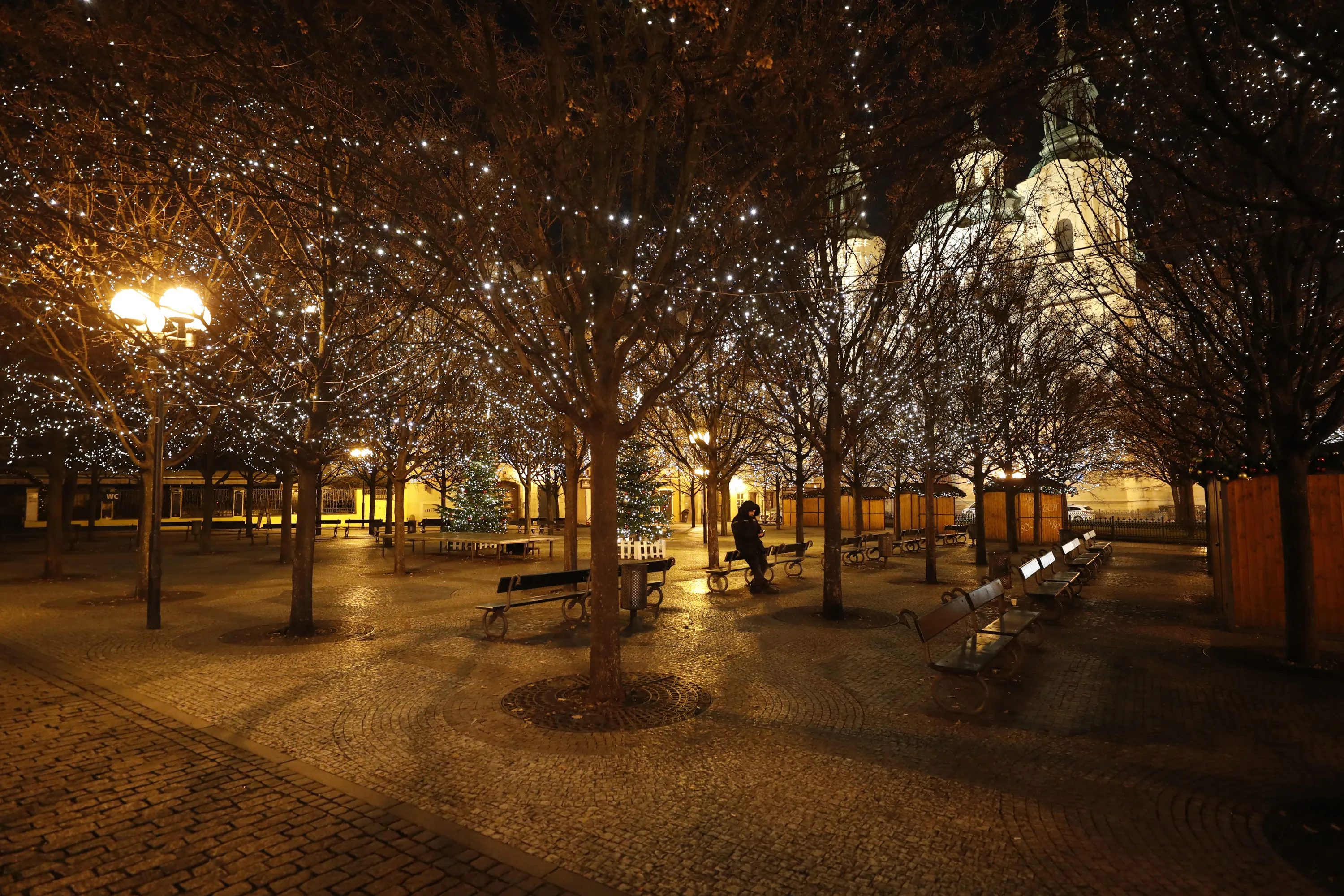 A security guard sits in the park near the Old Town Square in Prague, Czech Republic, Friday, January 1, 2021. Due to the surge in coronavirus infections police boosted their presence across the country on New Year's Eve to enforce a night-time curfew starting at 9 p.m. and other strict restrictive measures imposed by the government that make it impossible to stage traditional New Year's celebrations. (Photo by Petr David Josek/AP Photo)