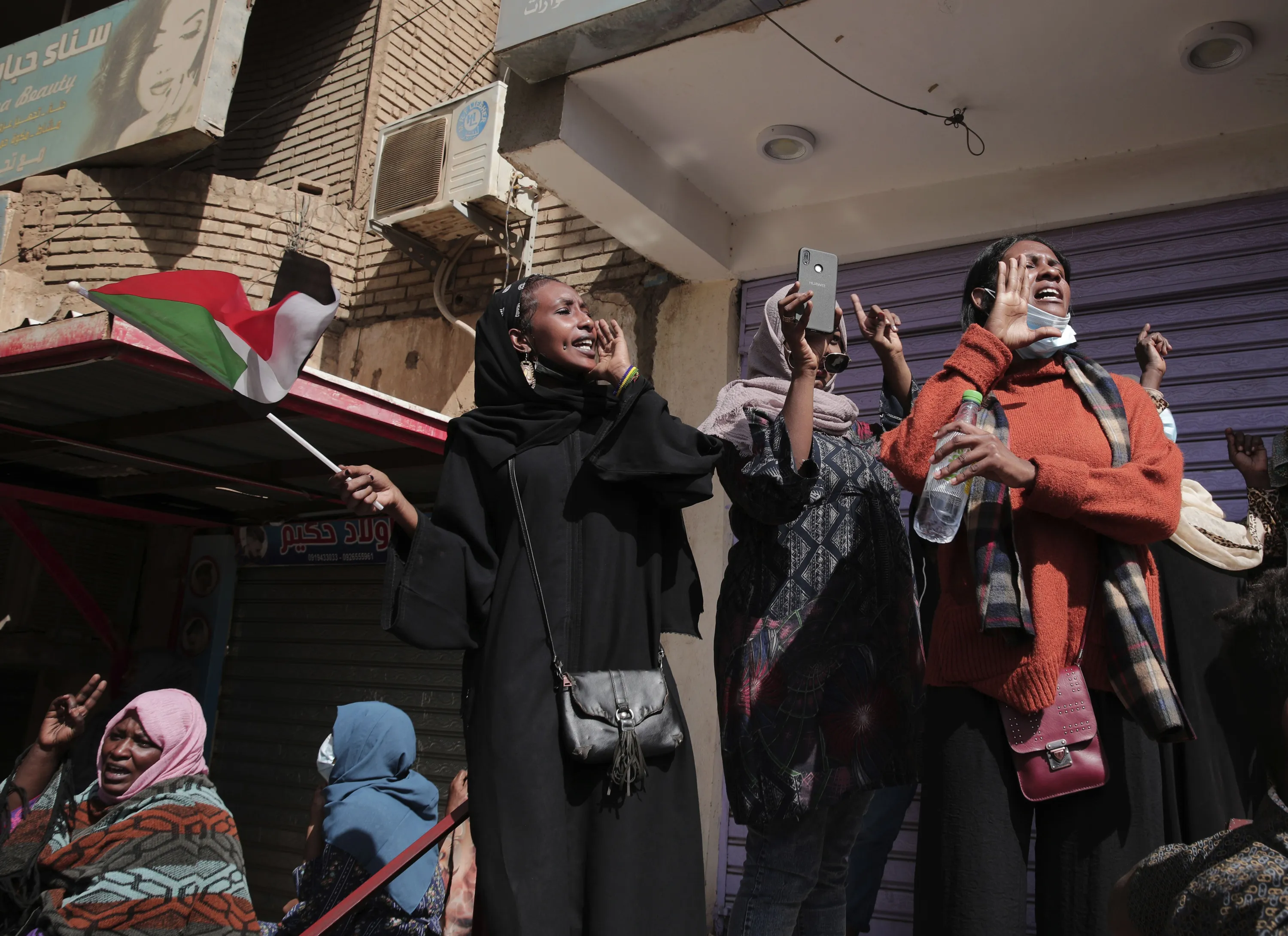 People chant slogans during a protest to denounce the October 2021 military coup, in Khartoum, Sudan, Sunday, January 2, 2022. Sudanese security forces fired tear gas Sunday to disperse protesters as thousands rallied against military rule, medics said. (Photo by Marwan Ali/AP Photo)