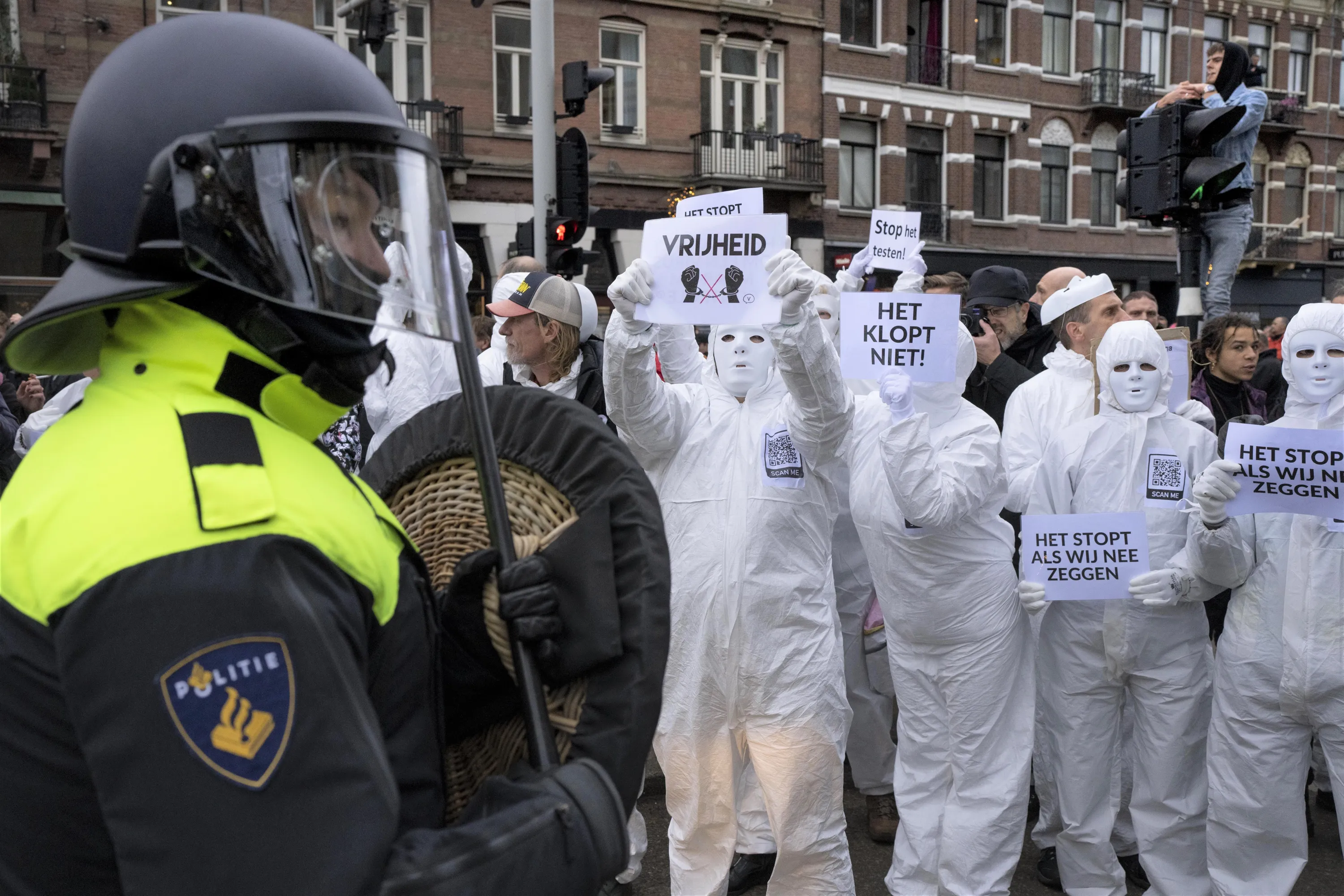 A protestor shows a sign reading “Vrijheid” or “Freedom” to a riot police as thousands of people defied a ban to gather and protest the Dutch government's coronavirus lockdown measures, in Amsterdam, Netherlands, Sunday, January 2, 2022. The municipality of the Dutch capital banned the protest, saying police had indications some demonstrators could be attending “prepared for violence”. (Photo by Peter Dejong/AP Photo)