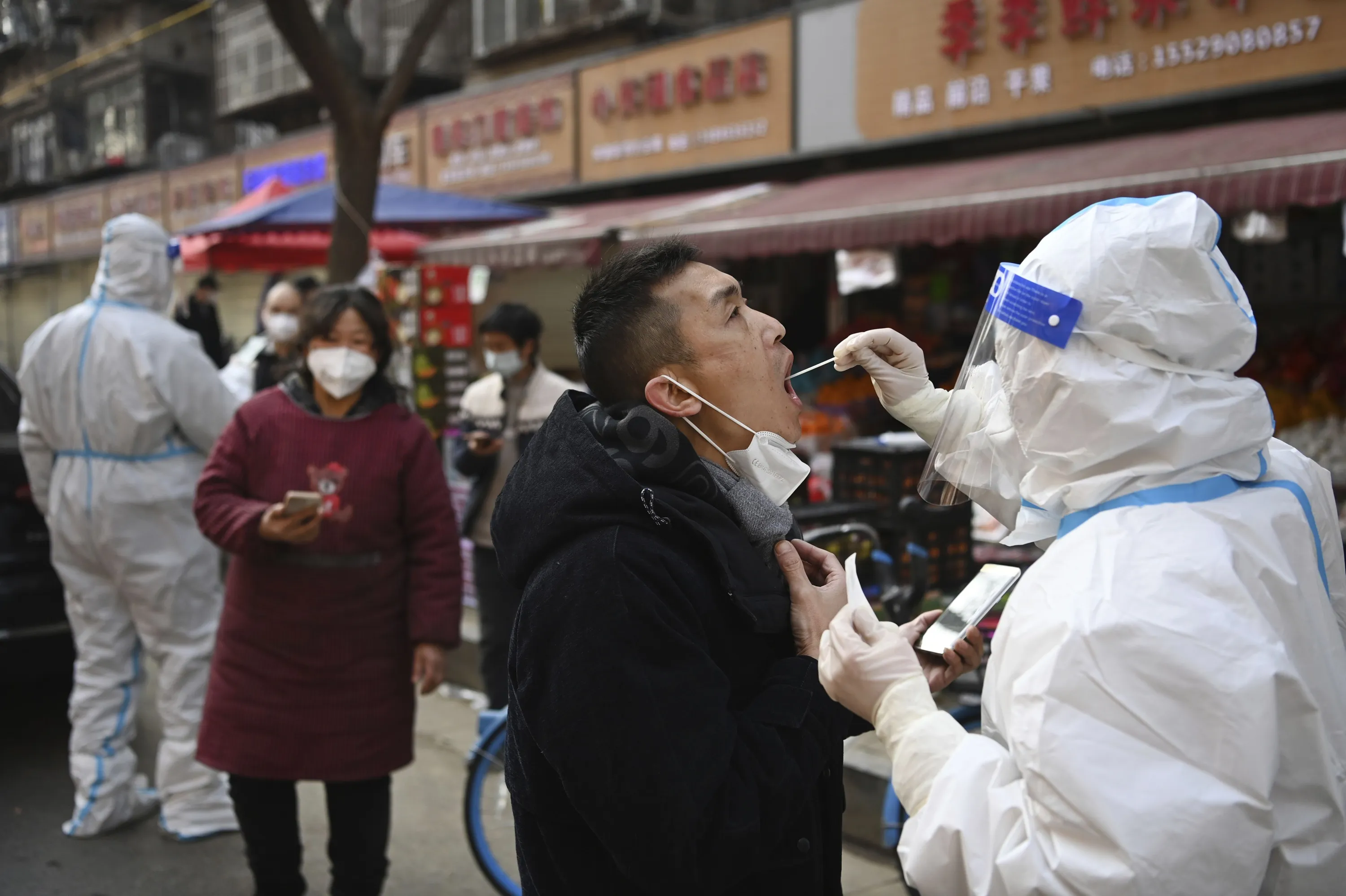 In this photo released by Xinhua News Agency, a medical worker collects swab sample from a businessman for COVID-19 test at a mobile testing site in Beilin District of Xi'an, in northwestern China's Shaanxi Province, January 2, 2022. Xi'an, an ancient capital with 13 million people is under the strictest lockdown of a major Chinese city since Wuhan was shut early last year at the start of the pandemic. (Photo by Tao Ming/Xinhua via AP Photo)