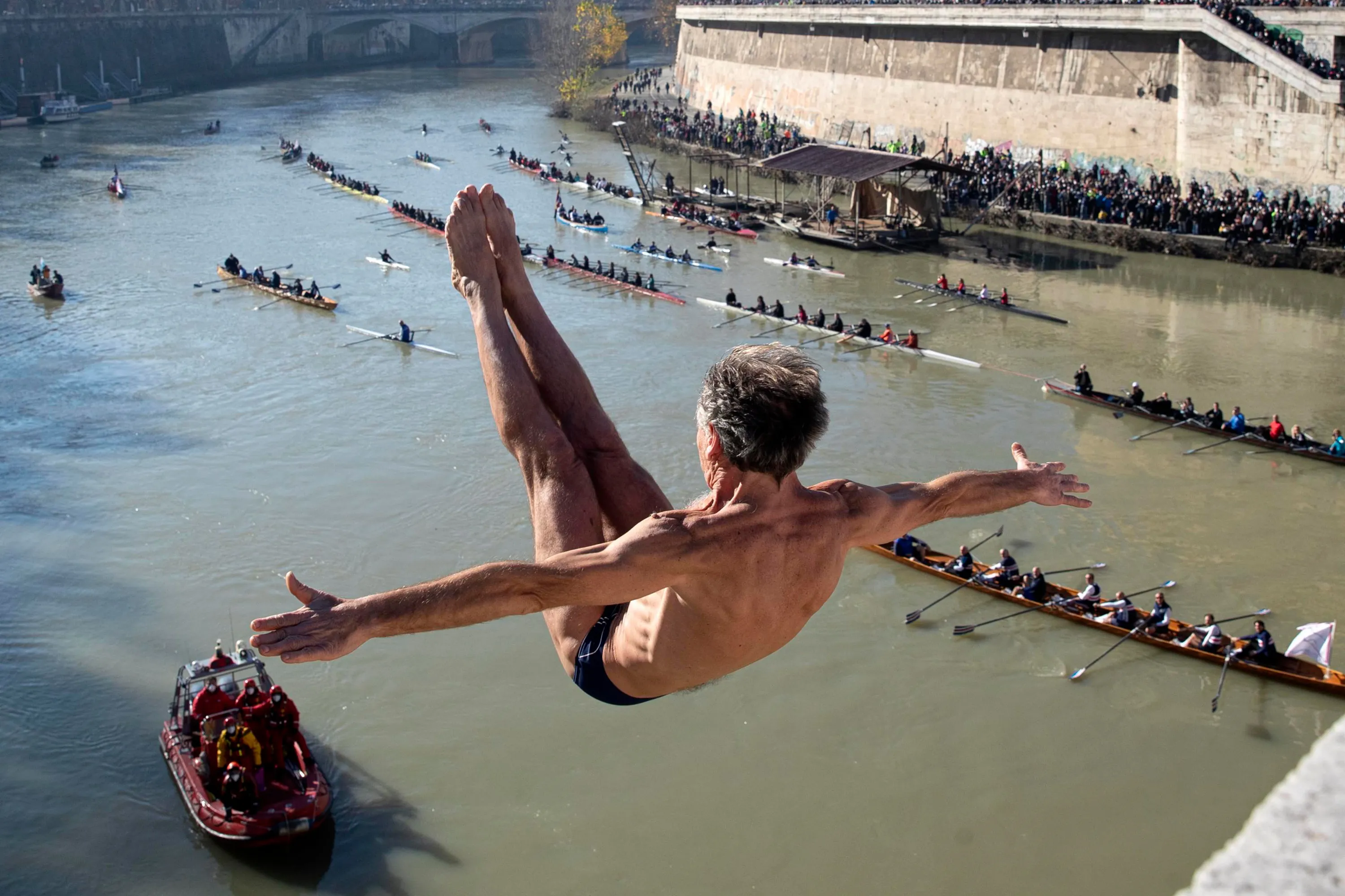 Italian Marco Fois jumps off Ponte Cavour bridge to dive into the Tiber river to celebrate the new year in Rome, Italy, 01 January 2022. During the New Year's Day tradition, swimmers jump from the parapet of the 15-meter-high bridge into the waters of the Tiber River. (Photo by Massimo Percossi/EPA/EFE)