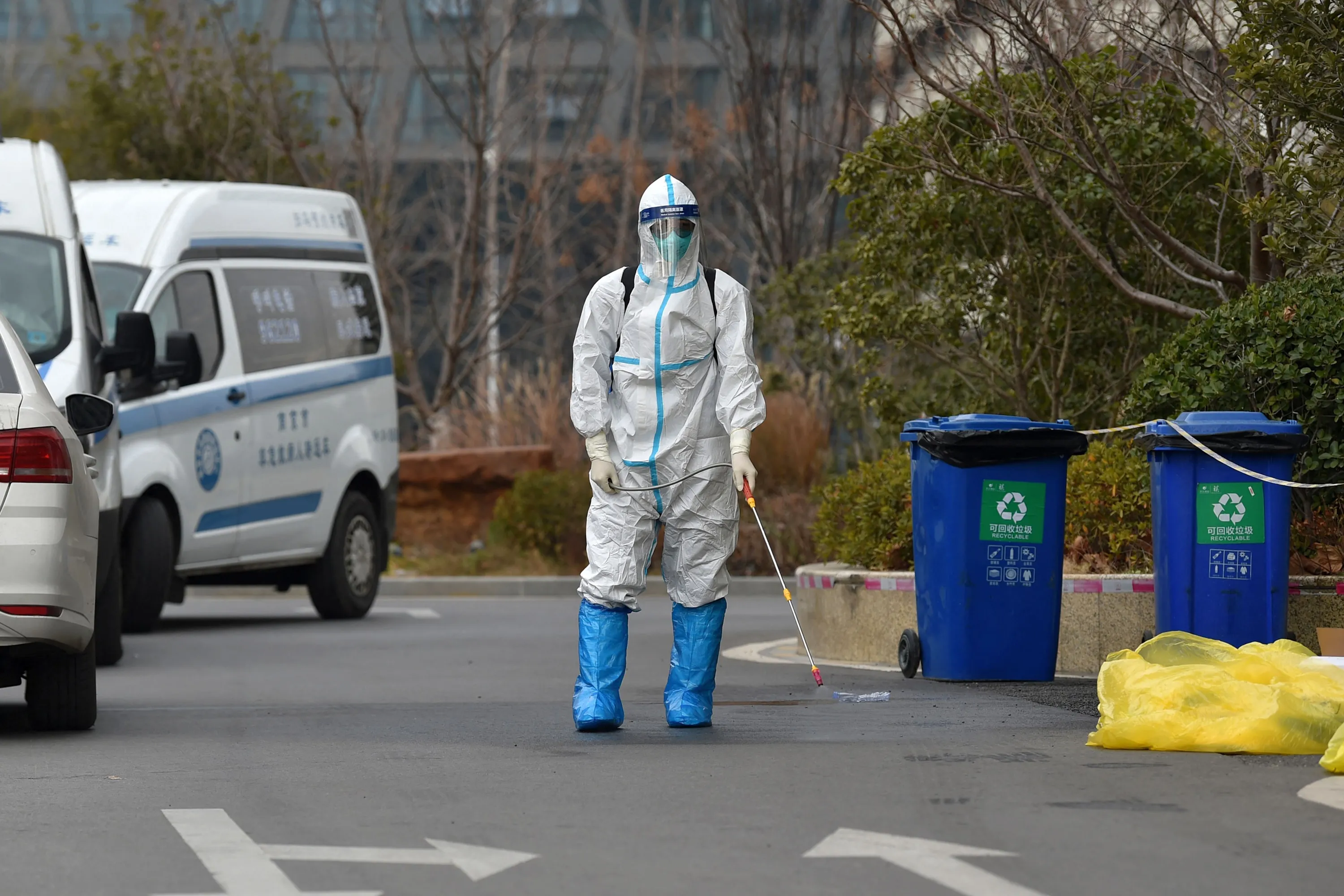 A staff member sprays disinfectant outside a hotel after one person tested positive for the Covid-19 coronavirus, in Nanjing in China's eastern Jiangsu province on December 28, 2021. (Photo by AFP Photo/China Stringer Network)