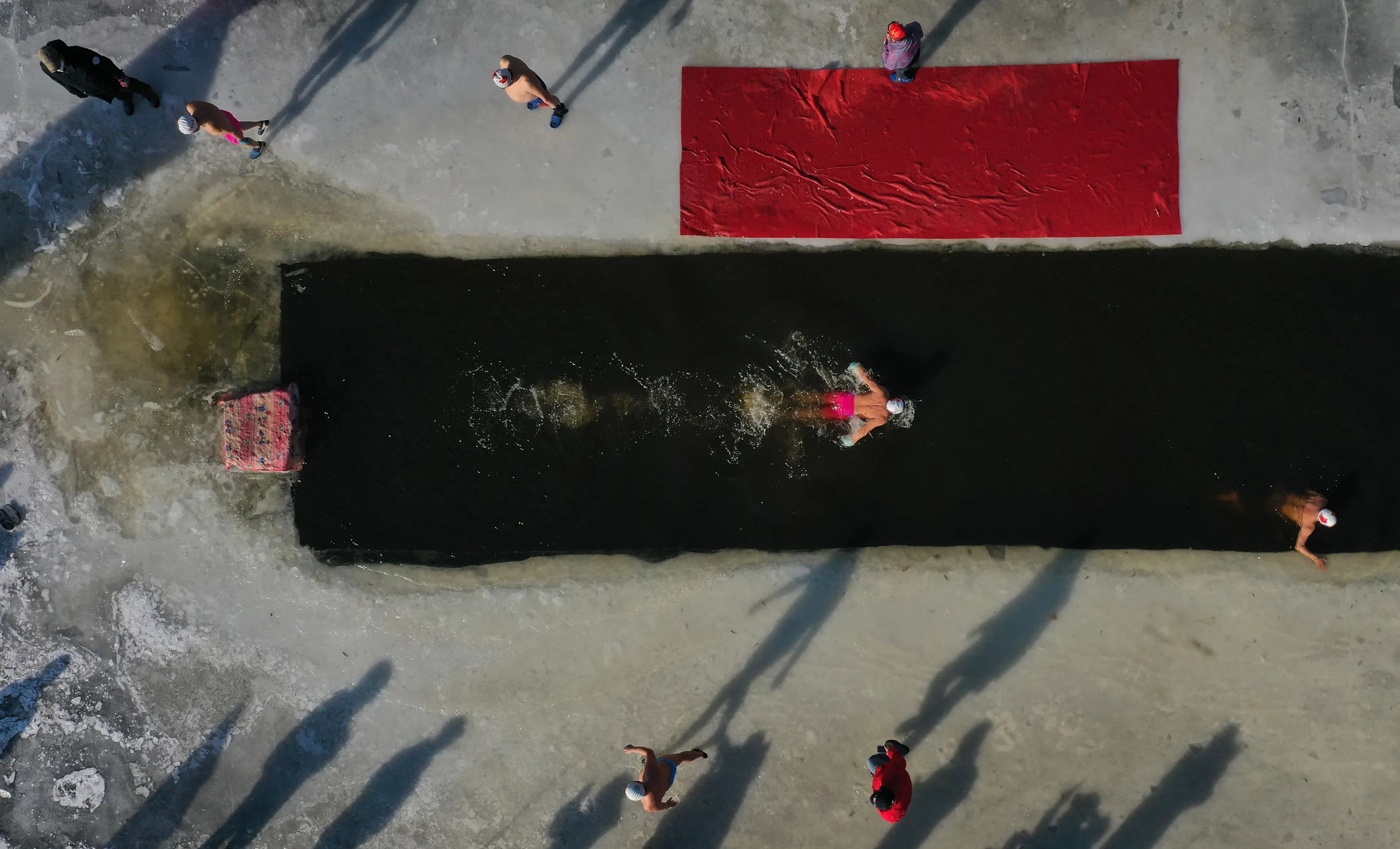 This aerial photo taken on December 31, 2021 shows a winter swimming enthusiast swimming in a partly frozen lake in Shenyang, in northeastern China's Liaoning province. (Photo by AFP Photo/China Stringer Network)