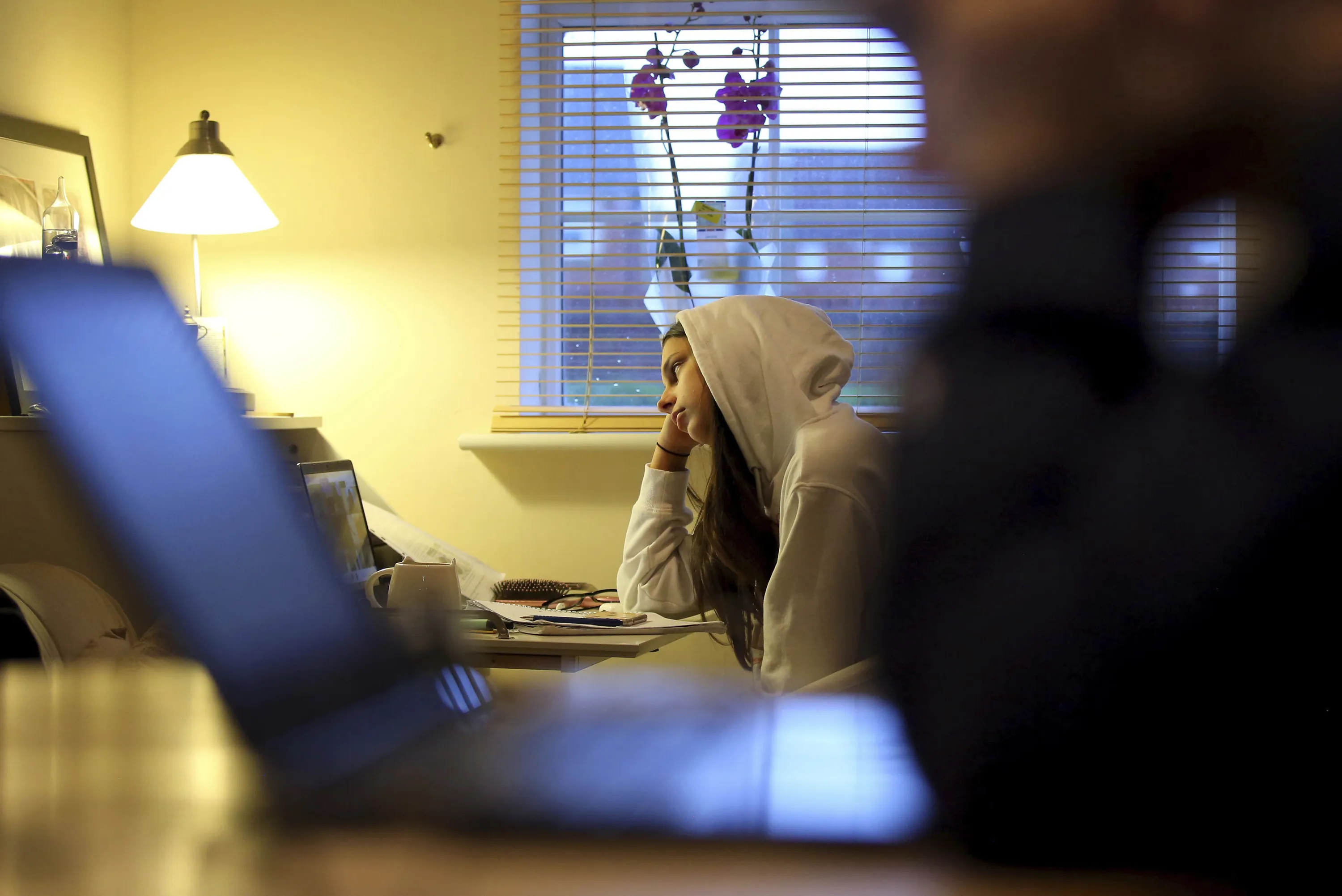 14-year old student Isla Stanton, begins her home school lesson via a video link, in Ashford, south England, Tuesday January 5, 2021, following new lockdown measures to limit the coronavirus including the closure of schools. The lockdown and home schooling has become a major issue, highlighting the wealth divide with provision of internet connectivity, equipment issues and the impact on upcoming school exams. Prime Minister Boris Johnson has set out further measures including closure of schools as part of a seven week lockdown period in a bid to halt the spread of the coronavirus.(Photo by Gareth Fuller/PA Wire via AP Photo)