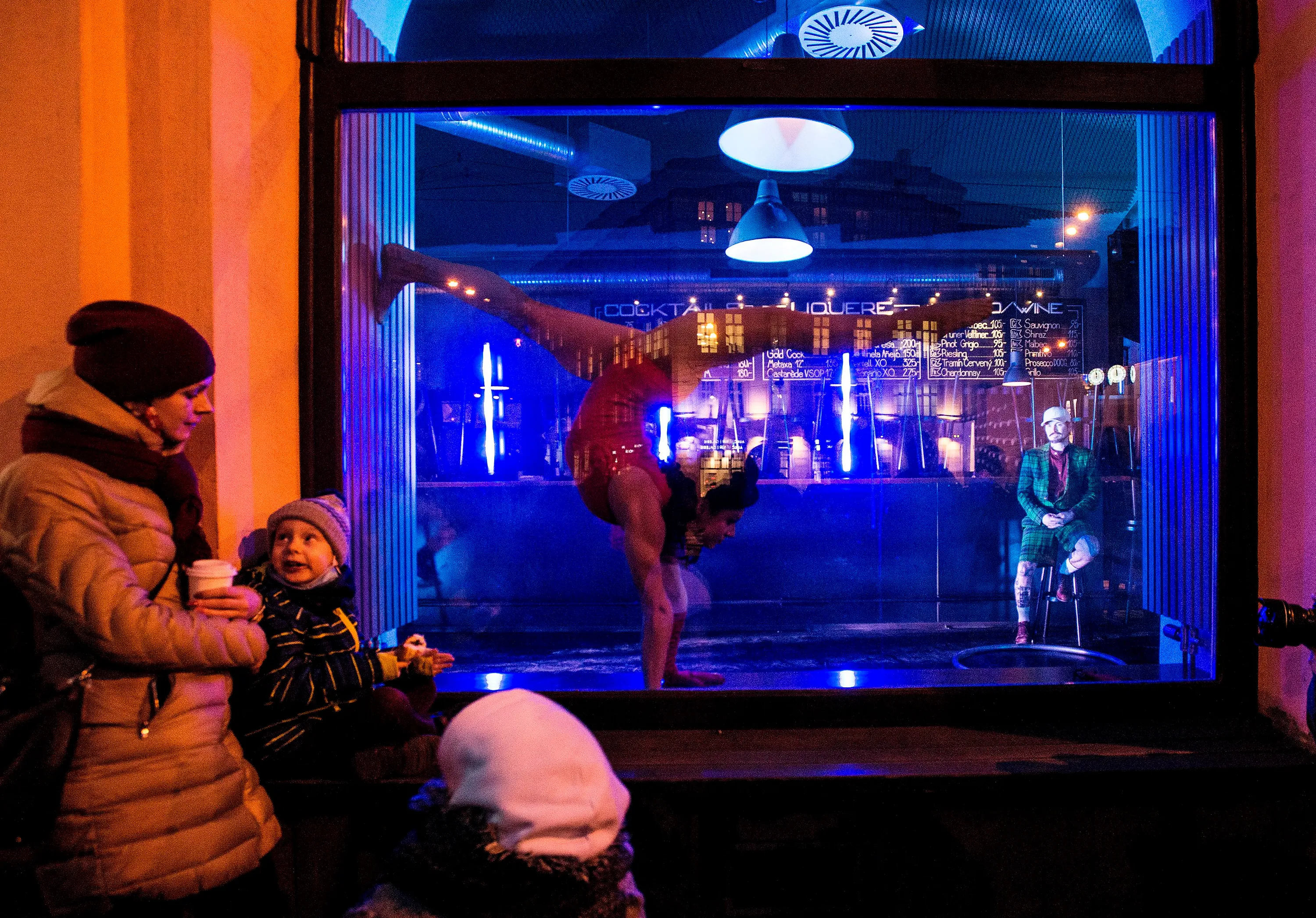 People watch a performance of members of the new circus company Cirk La Putyka in a pub window on January 21, 2021 in Prague as support of the culture sector hit by the pandemic of COVID -19. (Photo by Michal Cizek/AFP Photo)