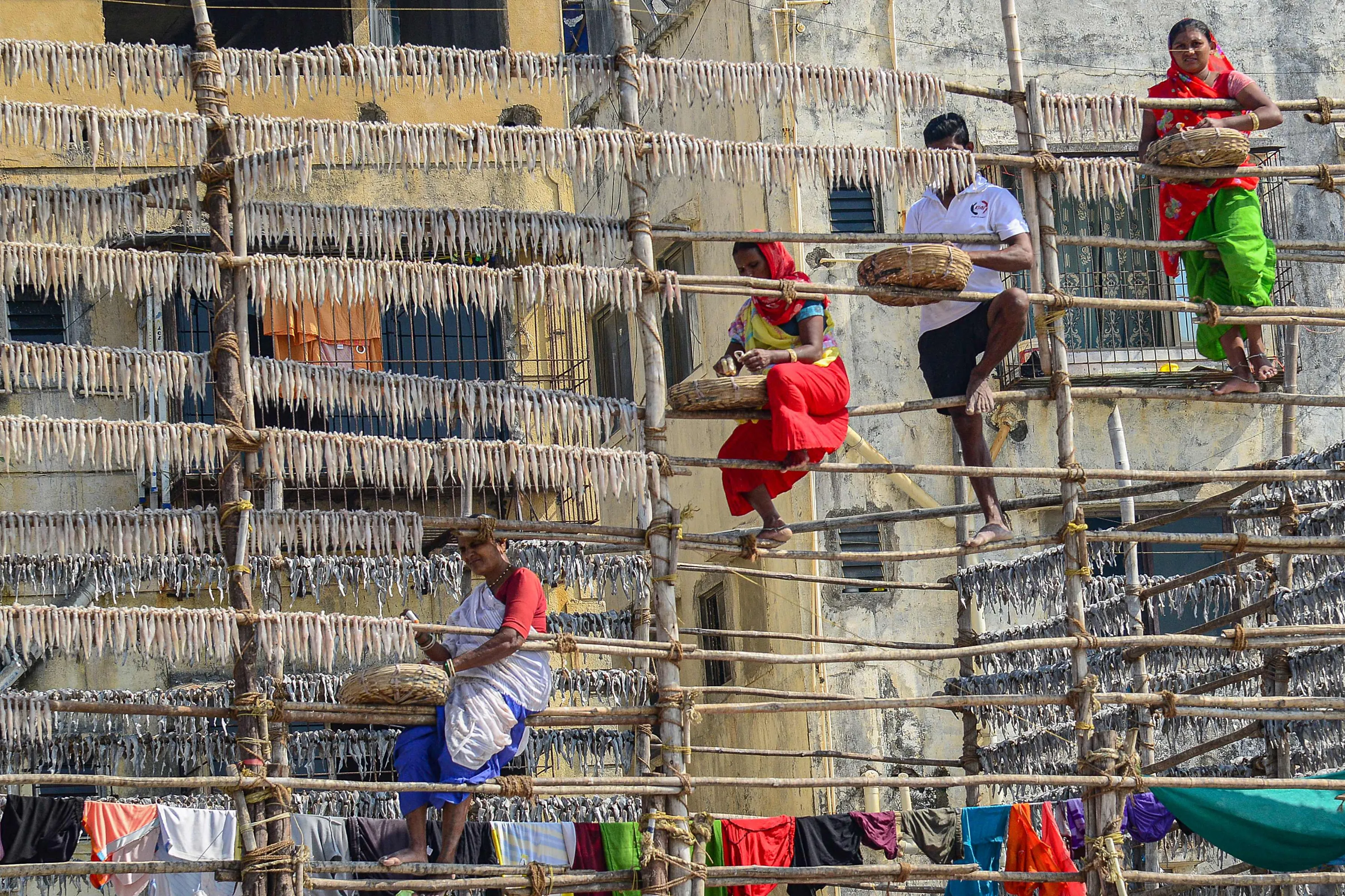Fisher-women climb up on a scaffolding to hang Bombay duck fish to dry in the sun at the Versova beach in Mumbai on December 29, 2021. (Photo by Sujit Jaiswal/AFP Photo)