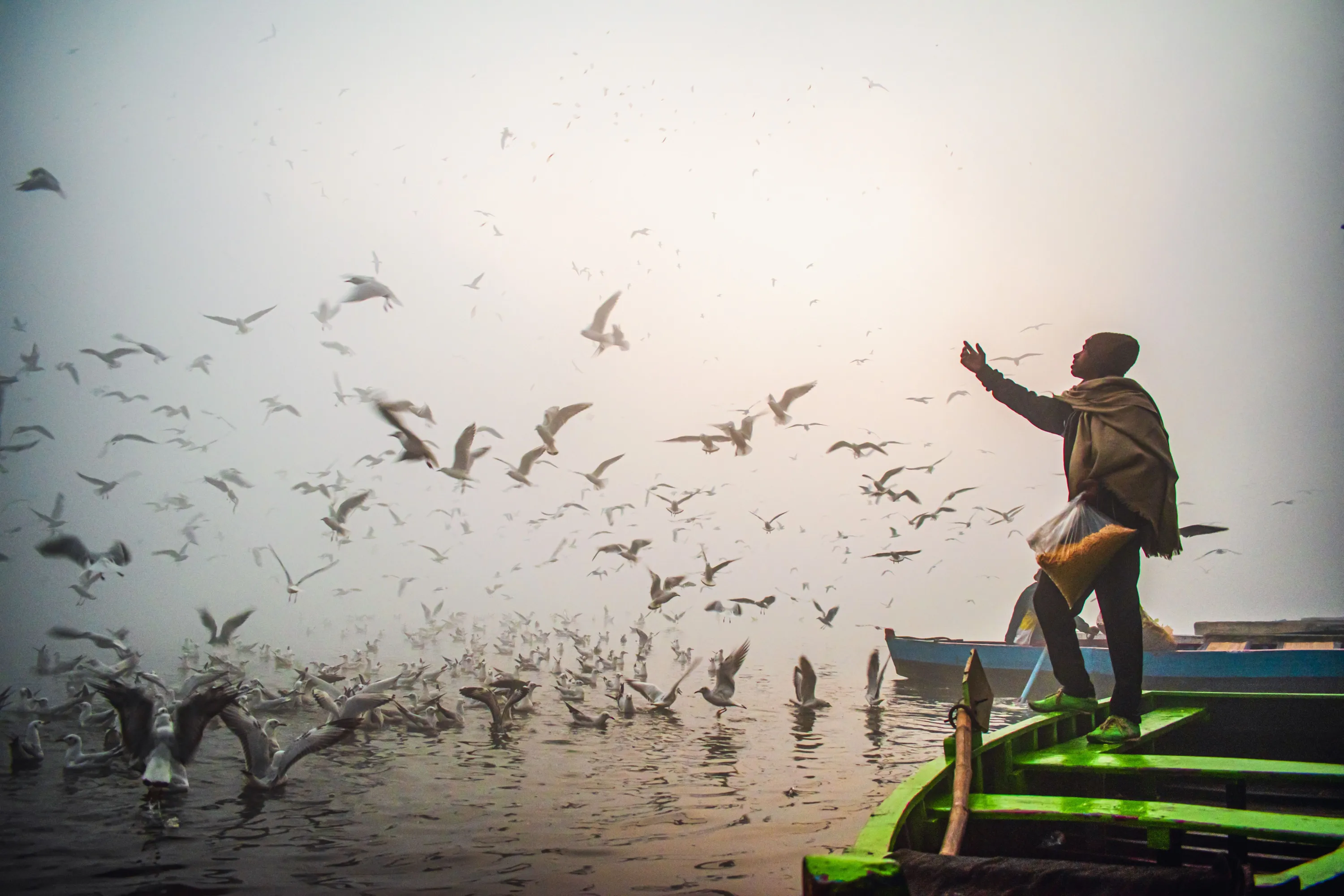 People arrive early in the morning on the bank of Yamuna River to see the migratory seagulls which comes from Siberia in winters on the first day of the 2022 year amid dense fog as Delhi plunged to minimum temperature dips to 4 degrees Celsius on the first day of New Year. (Photo by Mohsin Javed/Pacific Press/Rex Features/Shutterstock)