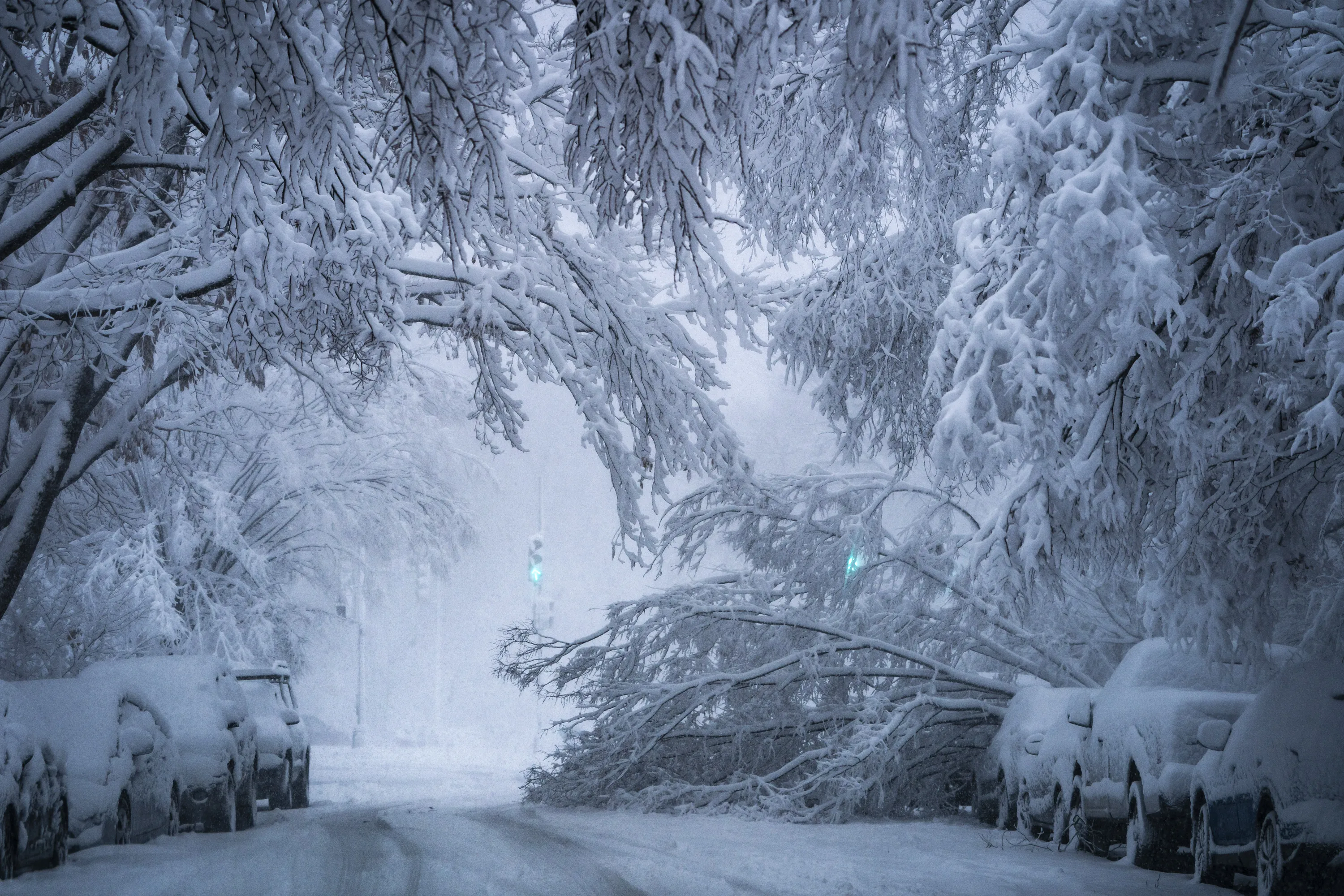A fallen tree blocks part of the road as it snows near Lincoln Park on Capitol Hill on Monday, January 03, 2022 in Washington, DC. (Photo by Jabin Botsford/The Washington Post)