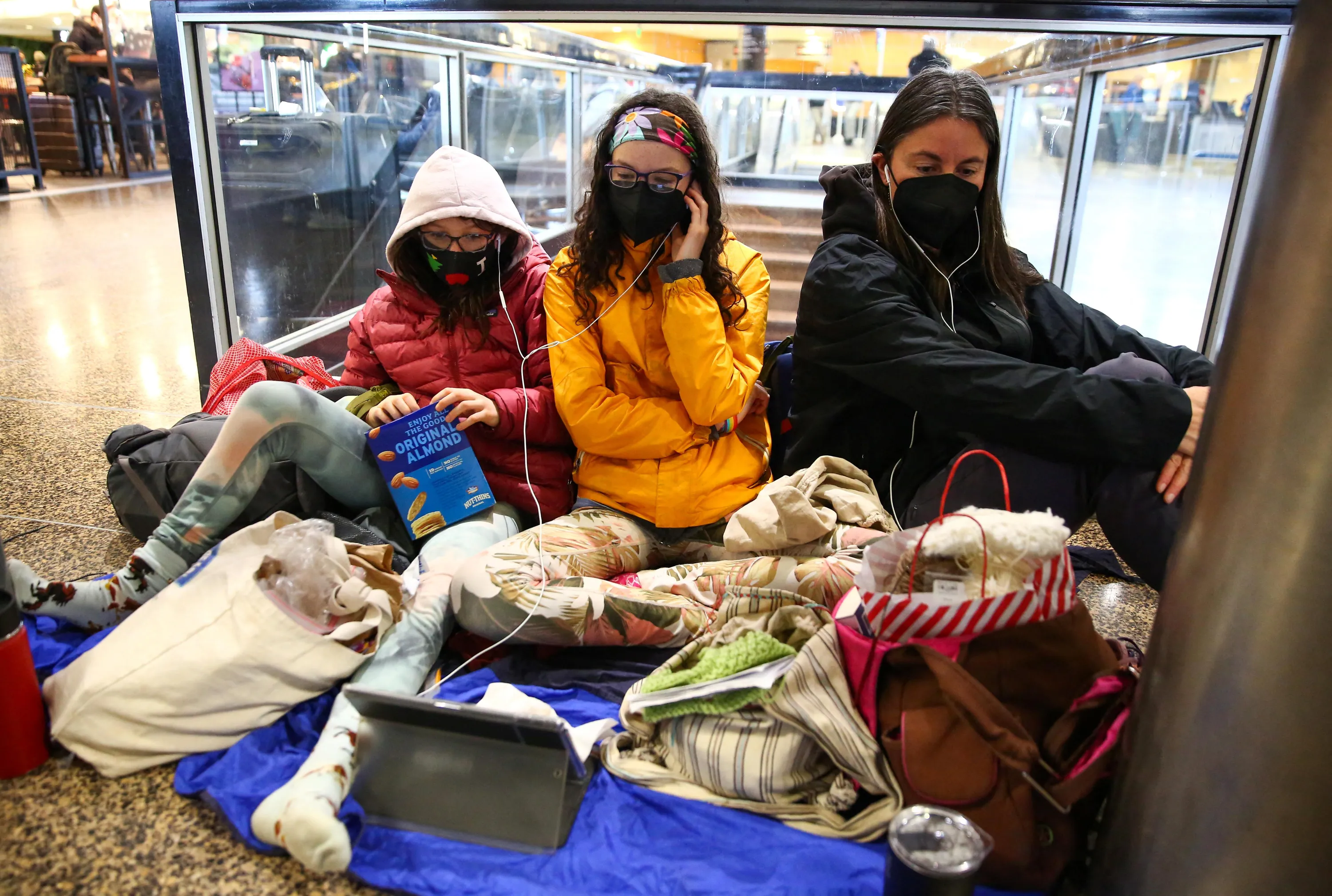 Lisa Cena of Bend, Oregon, watches videos with children Simone, 10, and Vida, 13, as they wait to check in for their flight after missing their original flight from Seattle to Hawaii the previous night due to delays at the Bend Municipal Airport, as dozens of flights were listed as cancelled or delayed at Seattle-Tacoma International Airport (Sea-Tac) in Seattle, Washington, U.S. December 27, 2021. (Photo by Lindsey Wasson/Reuters)