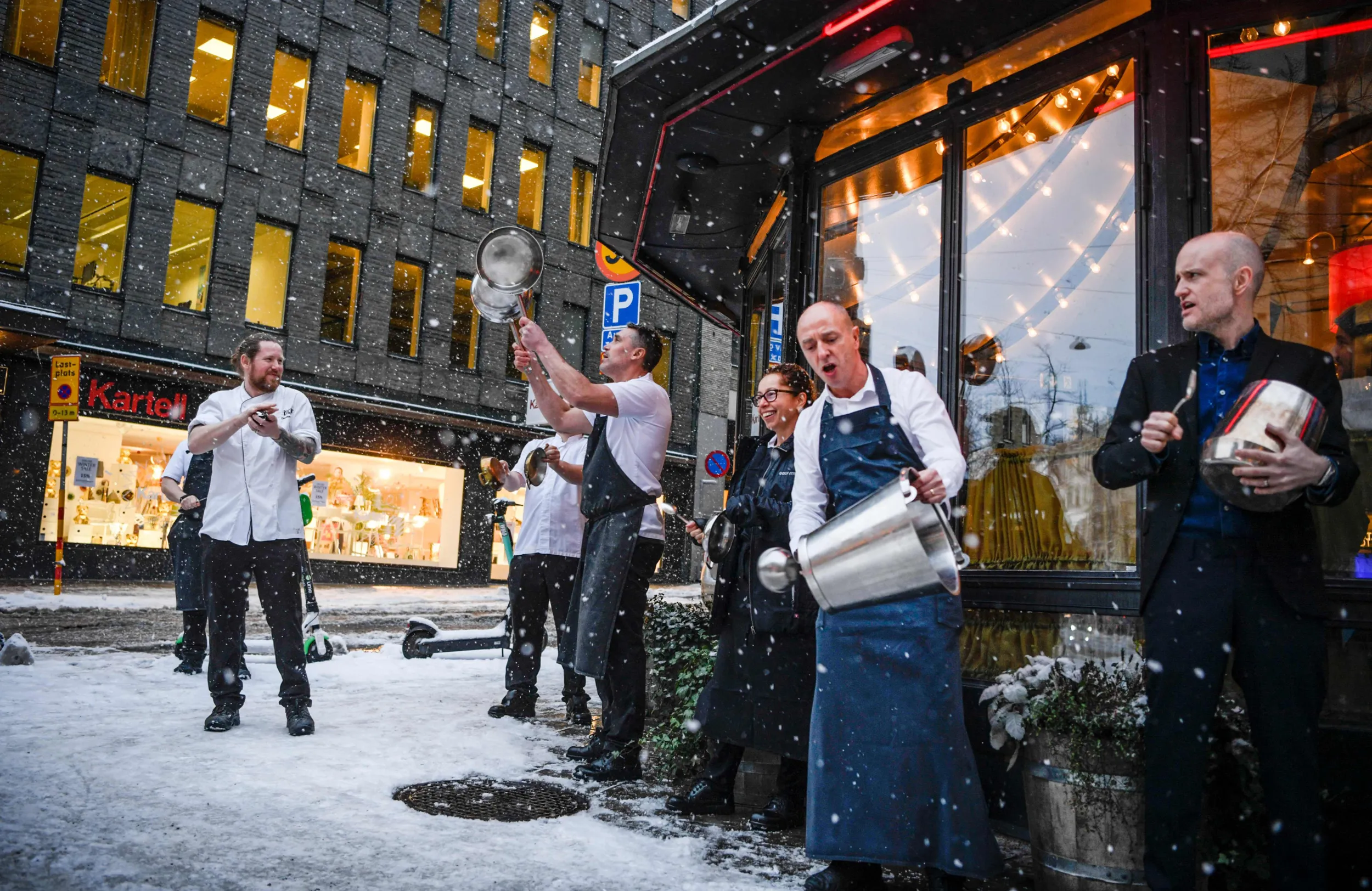 Restaurant owners and their staff make noise to protest against restrictions due to the corona (Covid-19) pandemic, outside a restaurant in central Stockholm, Sweden, on January 14, 2021. Serving alcohol at restaurants after 8 pm is not allowed until January 25, and a maximum of four guests are allowed to sit together. (Photo by Carl-Olof Zimmerman/TT News Agency/AFP Photo)