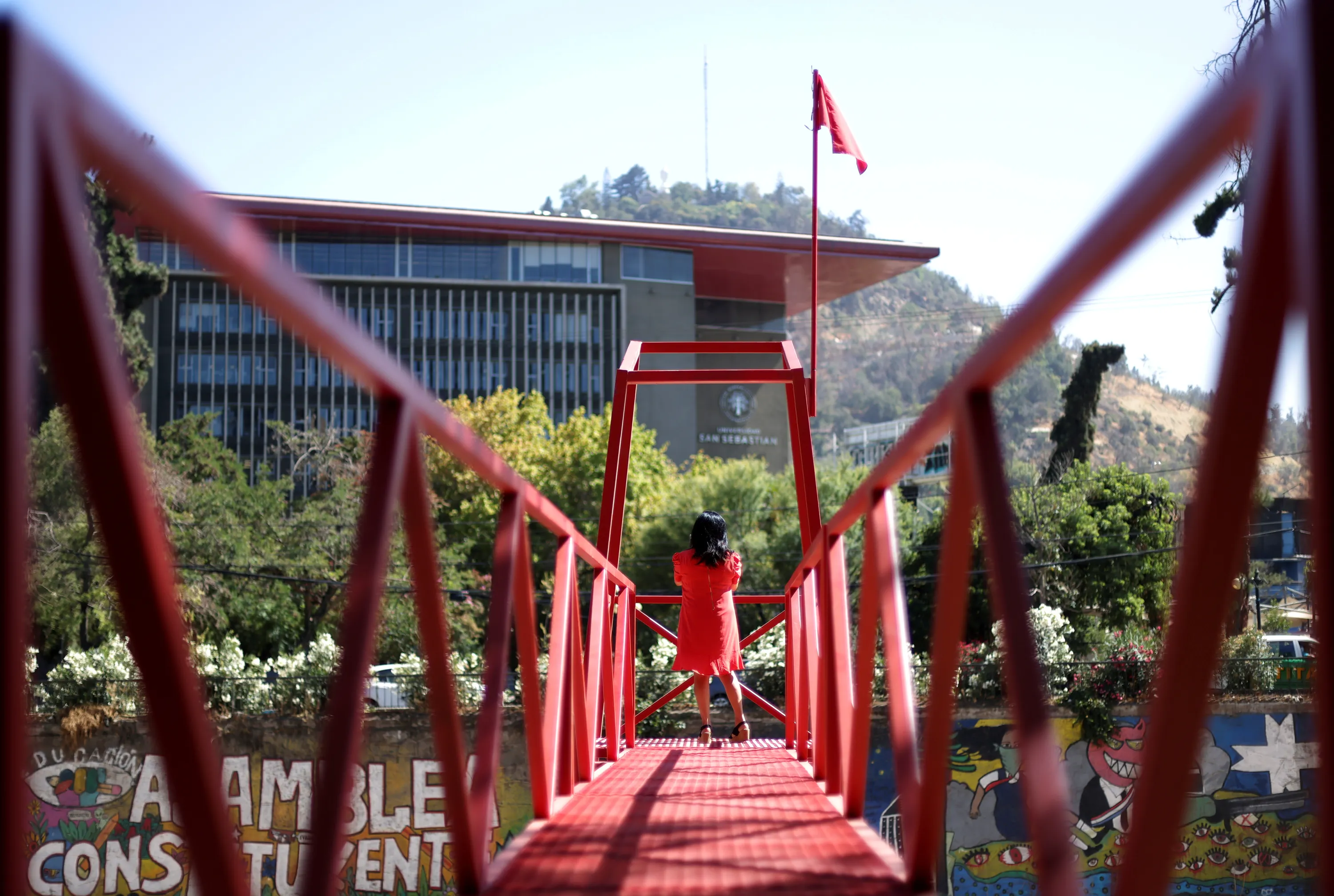 A woman stands at an urban intervention by chilean artist Ivan Navarro called “Rio de sangre” (Blood river), a tribute to the coronavirus disease (COVID-19) victims and in memory of the people that were thrown into the river before and during the Chilean dictatorship, during Santiago a Mil International Theatre Festival in Santiago, Chile, January 12, 2021. (Photo by Ivan Alvarado/Reuters)
