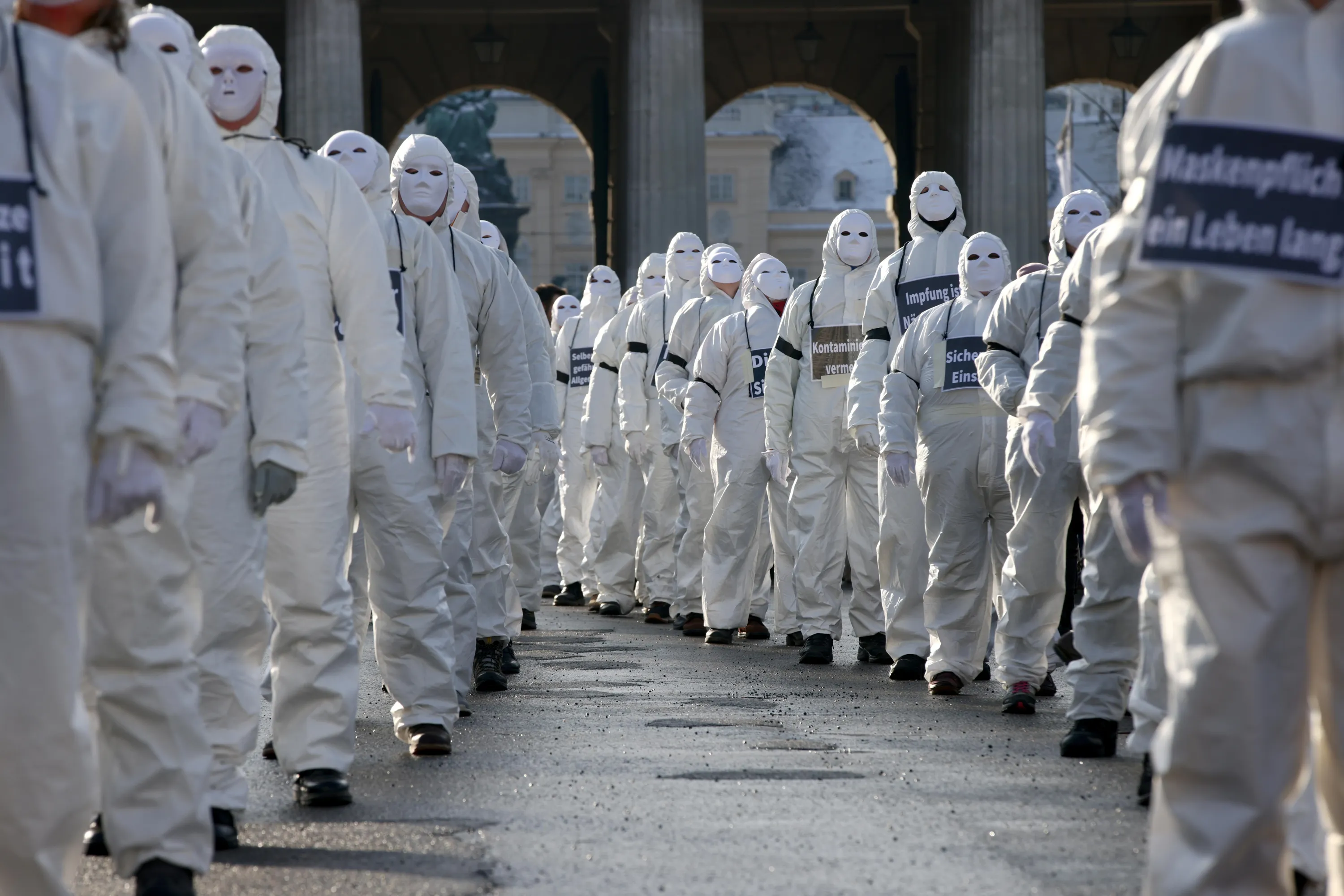Protesters in white suits and wearing masks attend a demonstration against the coronavirus disease (COVID-19) measures and their economic consequences in Vienna, Austria, January 16, 2021. (Photo by Lisi Niesner/Reuters)