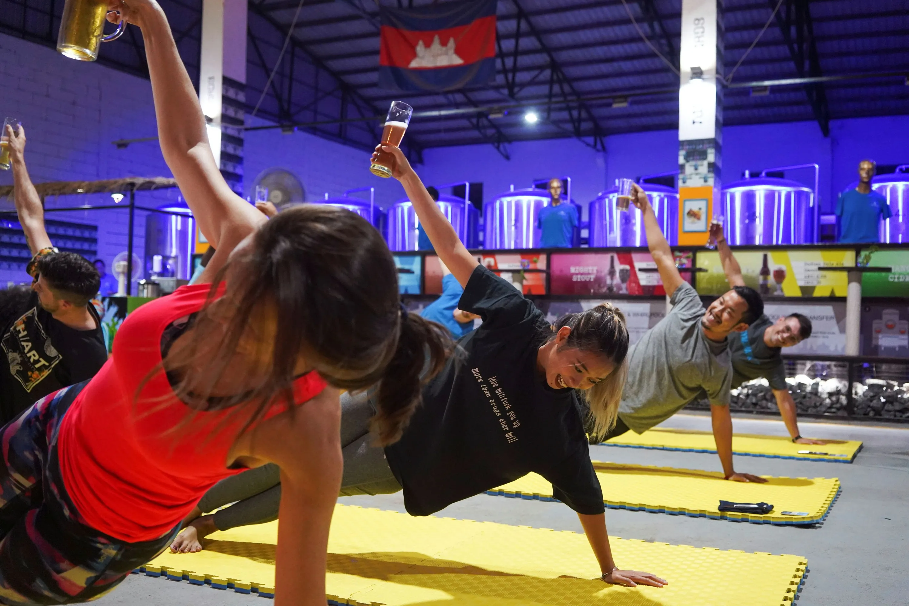 People participate in a beer yoga session, as the country eases the coronavirus disease (COVID-19) restrictions, at a craft brewery in Phnom Penh, Cambodia on January 19, 2021. (Photo by Cindy Liu/Reuters)