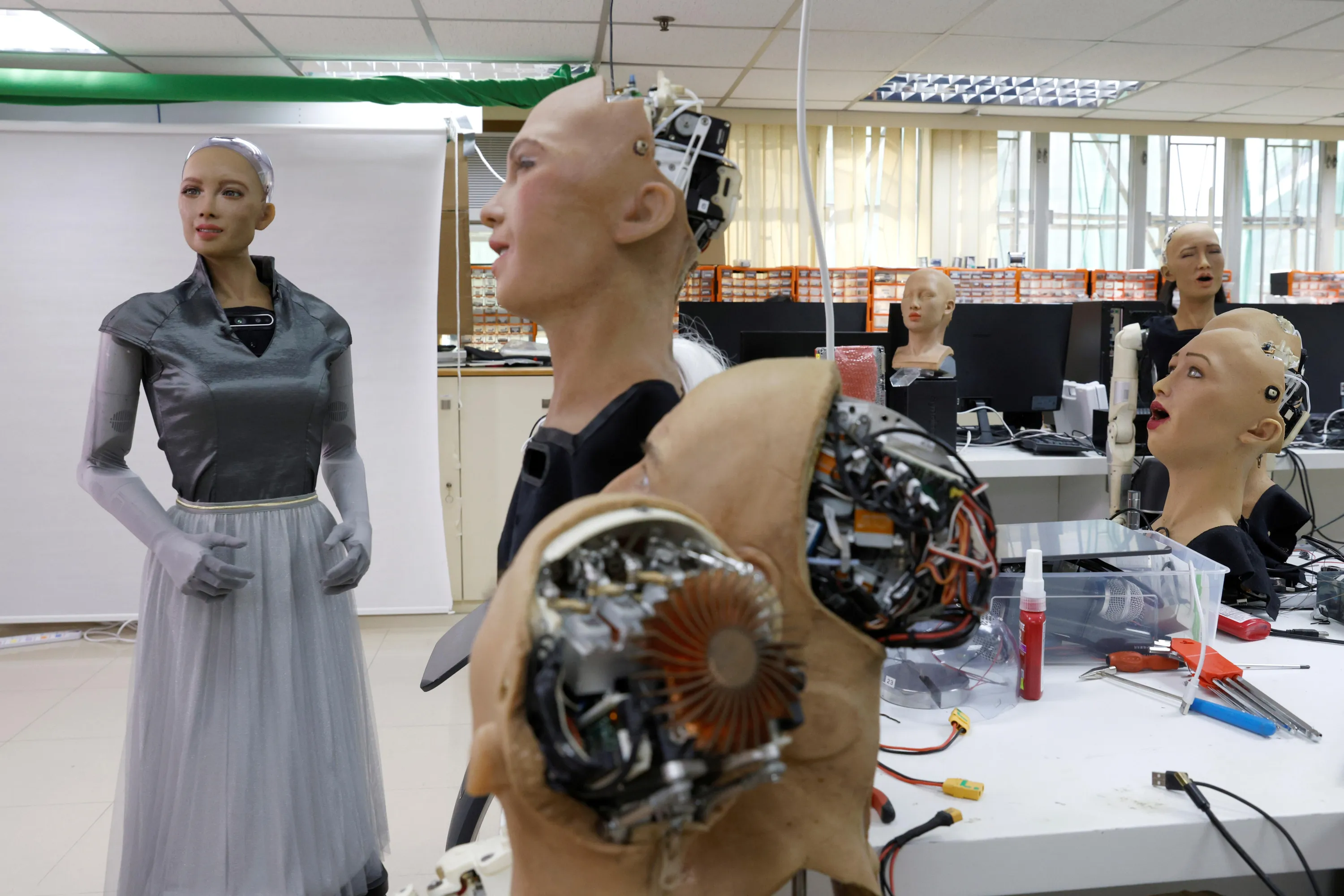 Humanoid robot Sophia developed by Hanson Robotics is pictured at the company's lab in Hong Kong, China on January 12, 2021. “Social robots like me can take care of the sick or elderly”, Sophia says as she conducts a tour of her lab in Hong Kong. “I can help communicate, give therapy and provide social stimulation, even in difficult situations”. Since being unveiled in 2016, Sophia – a humanoid robot – has gone viral. Now the company behind her has a new vision: to mass-produce robots by the end of the year. (Photo by Tyrone Siu/Reuters)