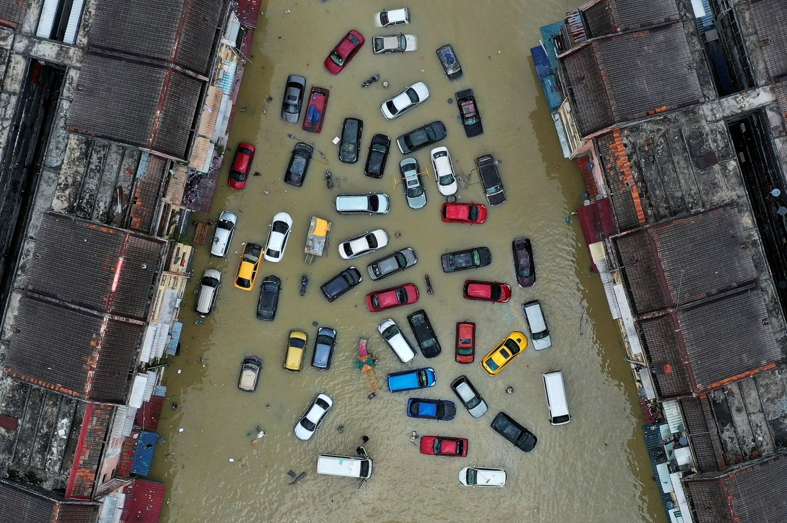 Aerial view shows vehicles and buildings inundated by floods in Shah Alam's Taman Sri Muda, one of the worst hit neighbourhoods in Selangor state, Malaysia, December 21, 2021. Picture taken with a drone. (Photo by Ebrahim Harris/Reuters)
