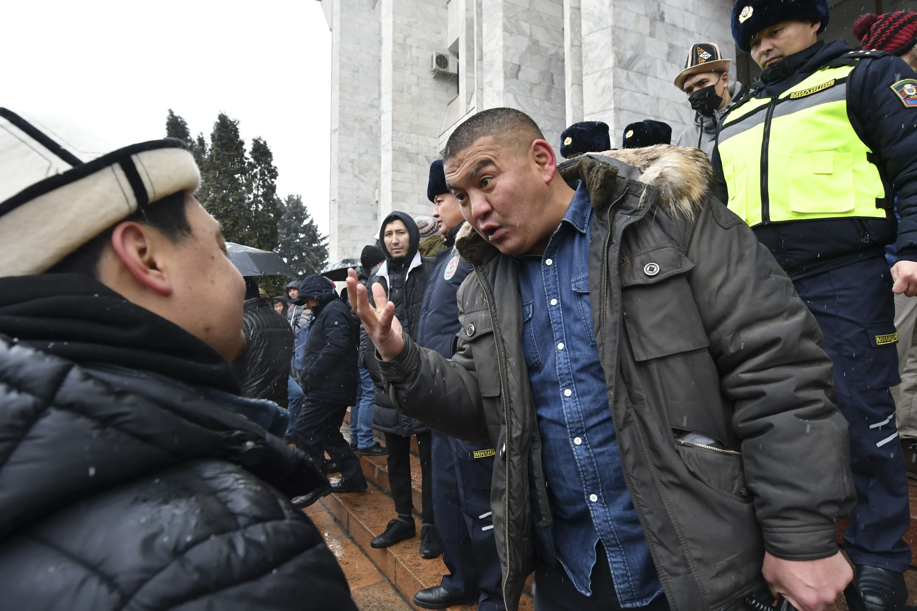 Protesters talk to each other as they gather in support of Kazakh opposition and against deploying Kyrgyzstan's troops to Kazakhstan during a rally in Bishkek, Kyrgyzstan, Friday, January 7, 2022. The Collective Security Treaty Organization, which includes the former Soviet republics of Kazakhstan, Belarus, Armenia, Tajikistan and Kyrgyzstan have started deploying troops to Kazakhstan for a peacekeeping mission after the worst street protests since the country gained independence three decades ago. The demonstrations began over a near-doubling of prices for a type of vehicle fuel and quickly spread across the country, reflecting wider discontent over the rule of the same party since independence. (Photo by Vladimir Voronin/AP Photo)