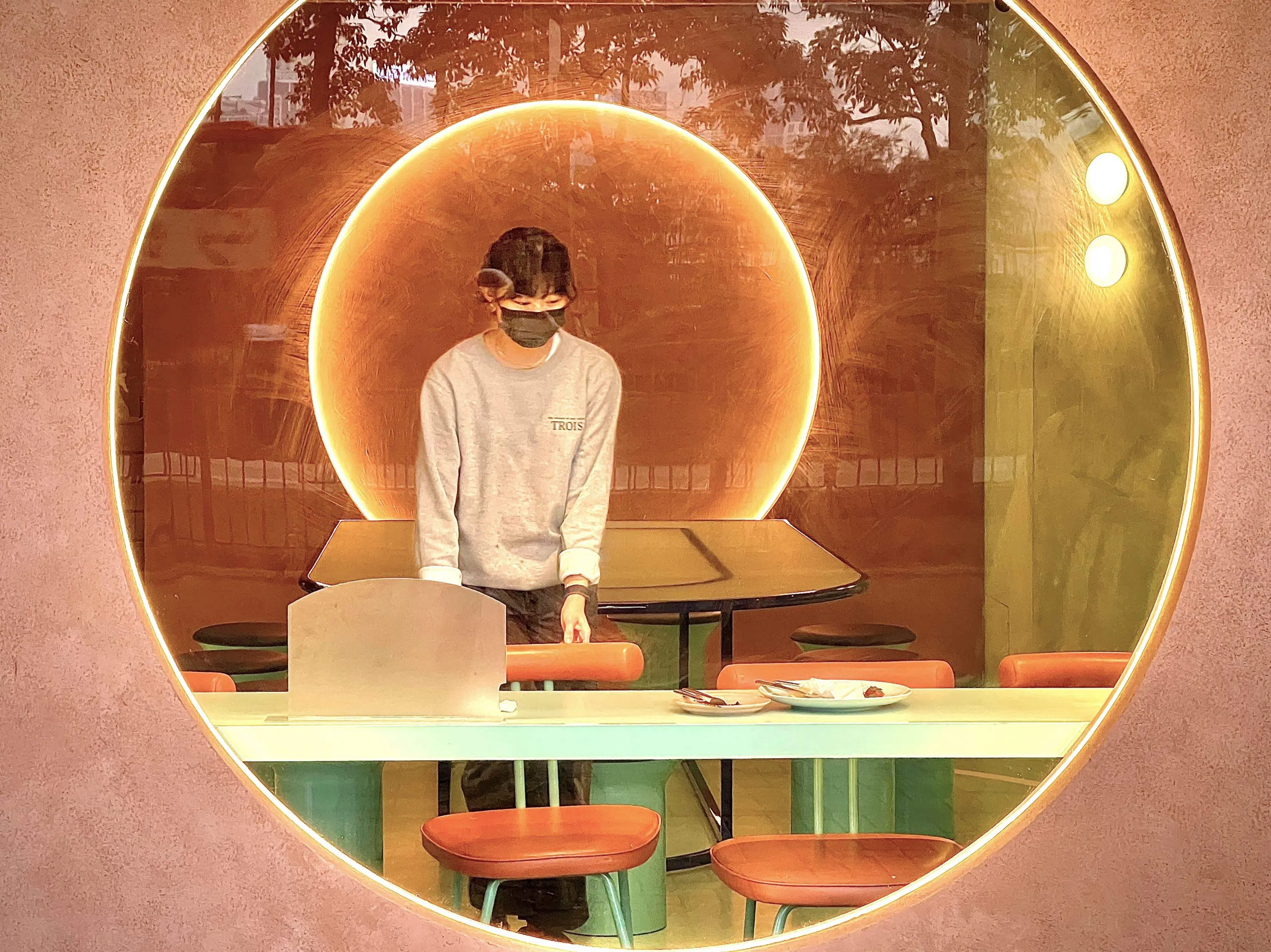A cafe employee cleans a table after the last customers left, halting service after a 6pm restaurant curfew took effect in an attempt to fight Covid-19 and any spread of the new Omicron variant in Hong Kong on January 7, 2022. (Photo by Mladen Antonov/AFP Photo)