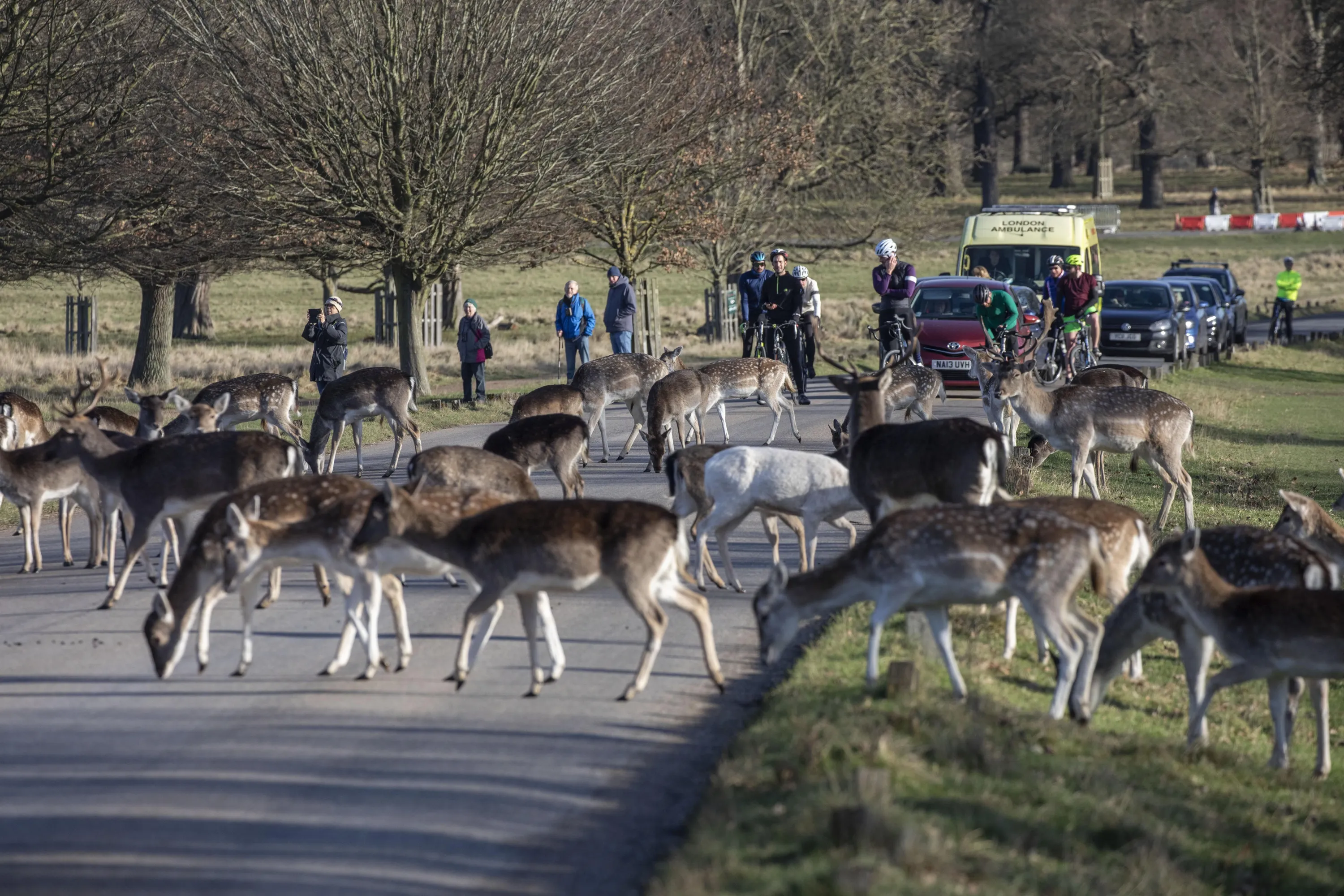 Traffic and pedestrians wait to pass as a herd of fallow deer cross the road in Richmond Park, southwest London on January 5, 2022. (Photo by Jack Hill/The Times)