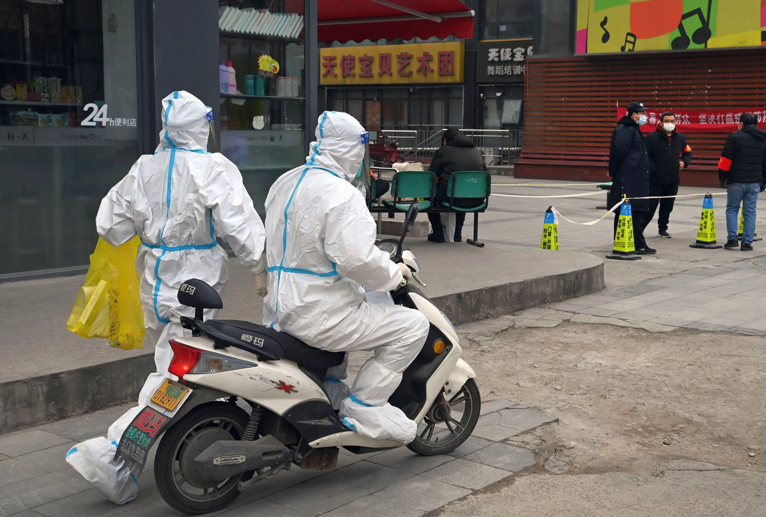 Delivery riders escort medical staff to a nucleic acid sampling site in Xi'an, northwest China's Shaanxi Province, December 30, 2021. After the outbreak of COVID-19 in Xi'an, many delivery riders volunteer to deliver daily necessities and register information for nucleic acid test. (Photo by Li Yibo/Xinhua/Alamy Live News)