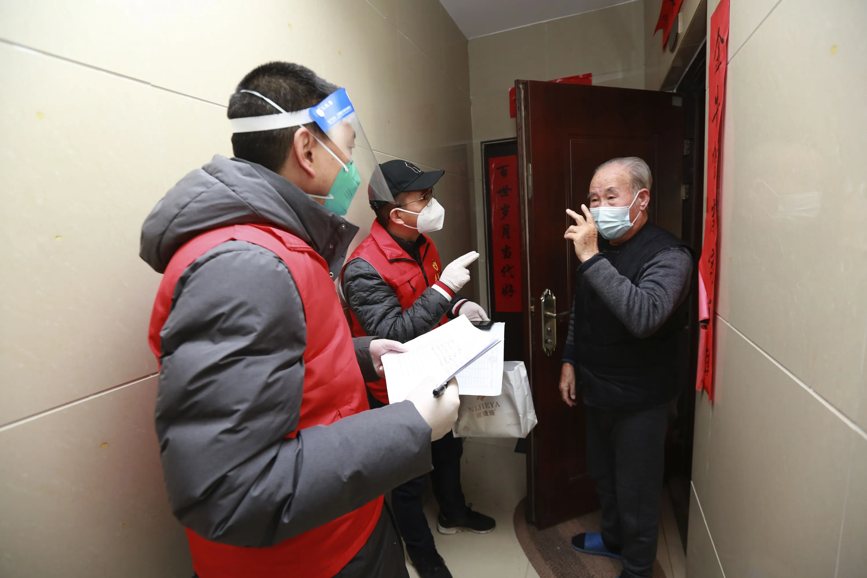 Community volunteers visit residents to find out their needs at a residential block in Xi'an city in northwest China's Shaanxi province Monday, January 3, 2022. (Photo by Chinatopix via AP Photo)