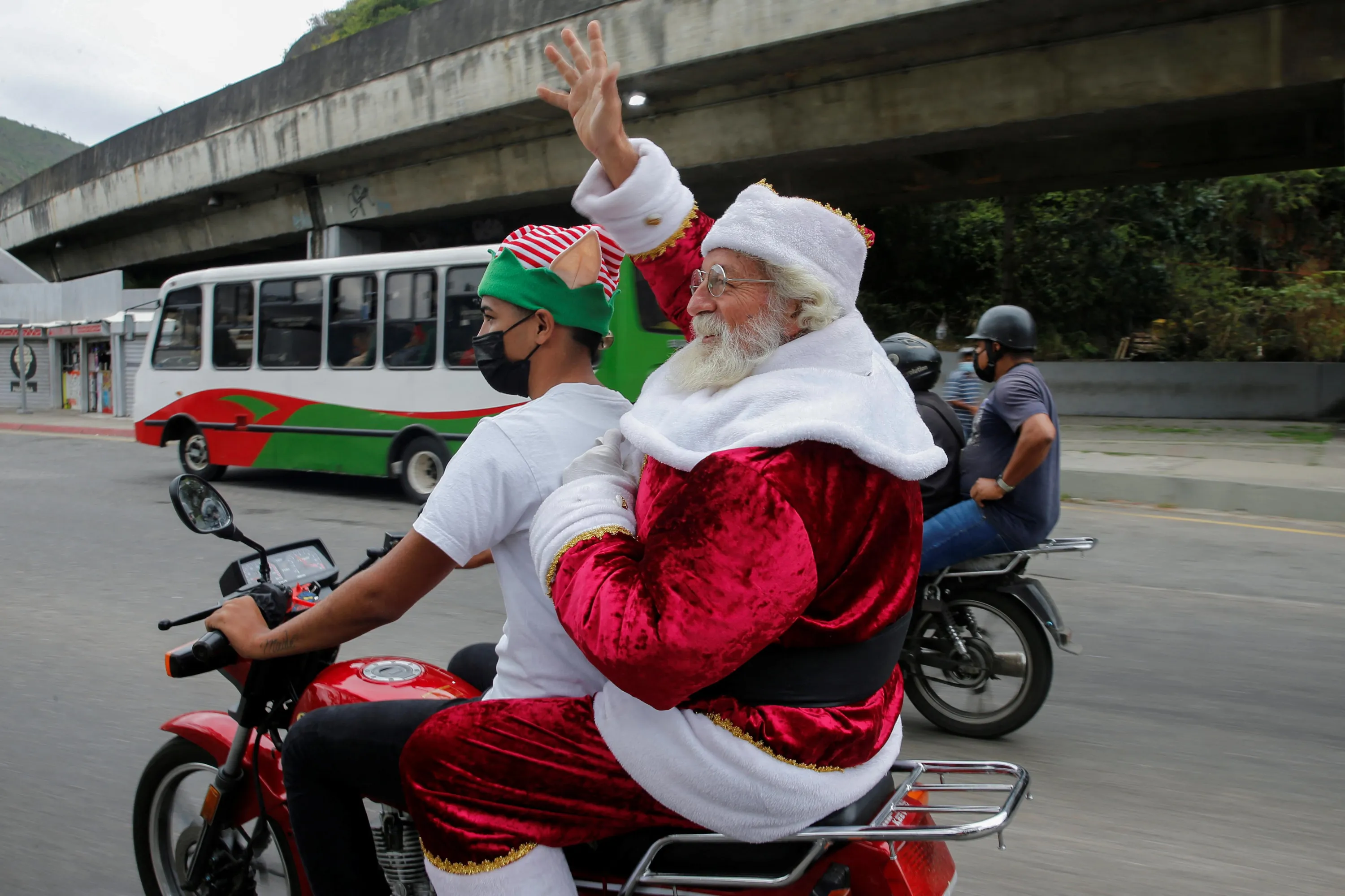 A man dressed as Santa Claus rides on a motorcycle during a Christmas toy distribution organized by a Venezuelan journalists group, in Caracas, Venezuela on December 17, 2021. (Photo by Leonardo Fernandez Viloria/Reuters)