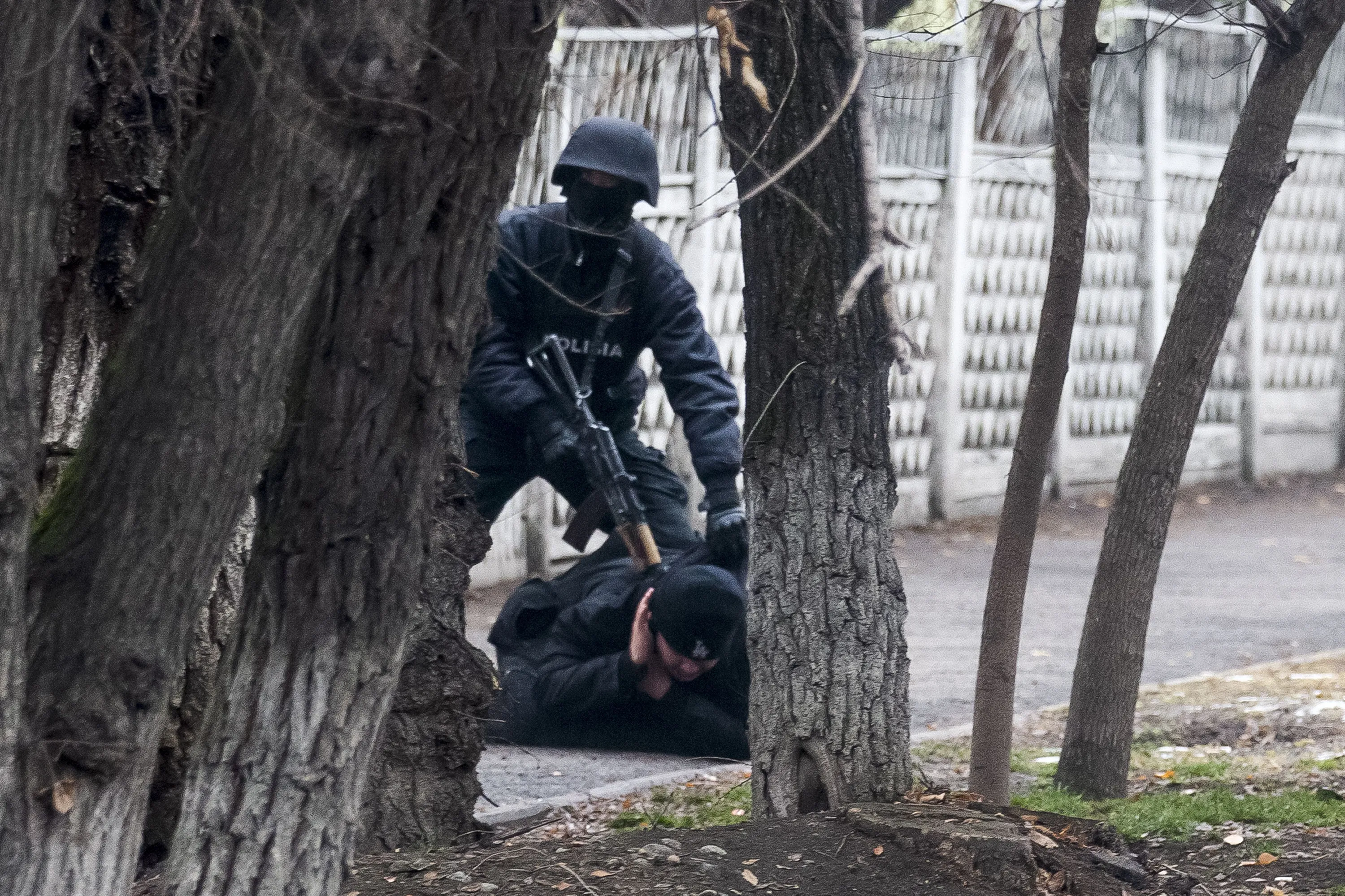 An armed riot police officer detains a protester during a security anti-terrorists operation in a street after clashes in Almaty, Kazakhstan, Saturday, January 8, 2022. Kazakhstan's president authorized security forces on Friday to shoot to kill those participating in unrest, opening the door for a dramatic escalation in a crackdown on anti-government protests that have turned violent. The Central Asian nation this week experienced its worst street protests since gaining independence from the Soviet Union three decades ago, and dozens have been killed in the tumult. (Photo by Vasily Krestyaninov/AP Photo)