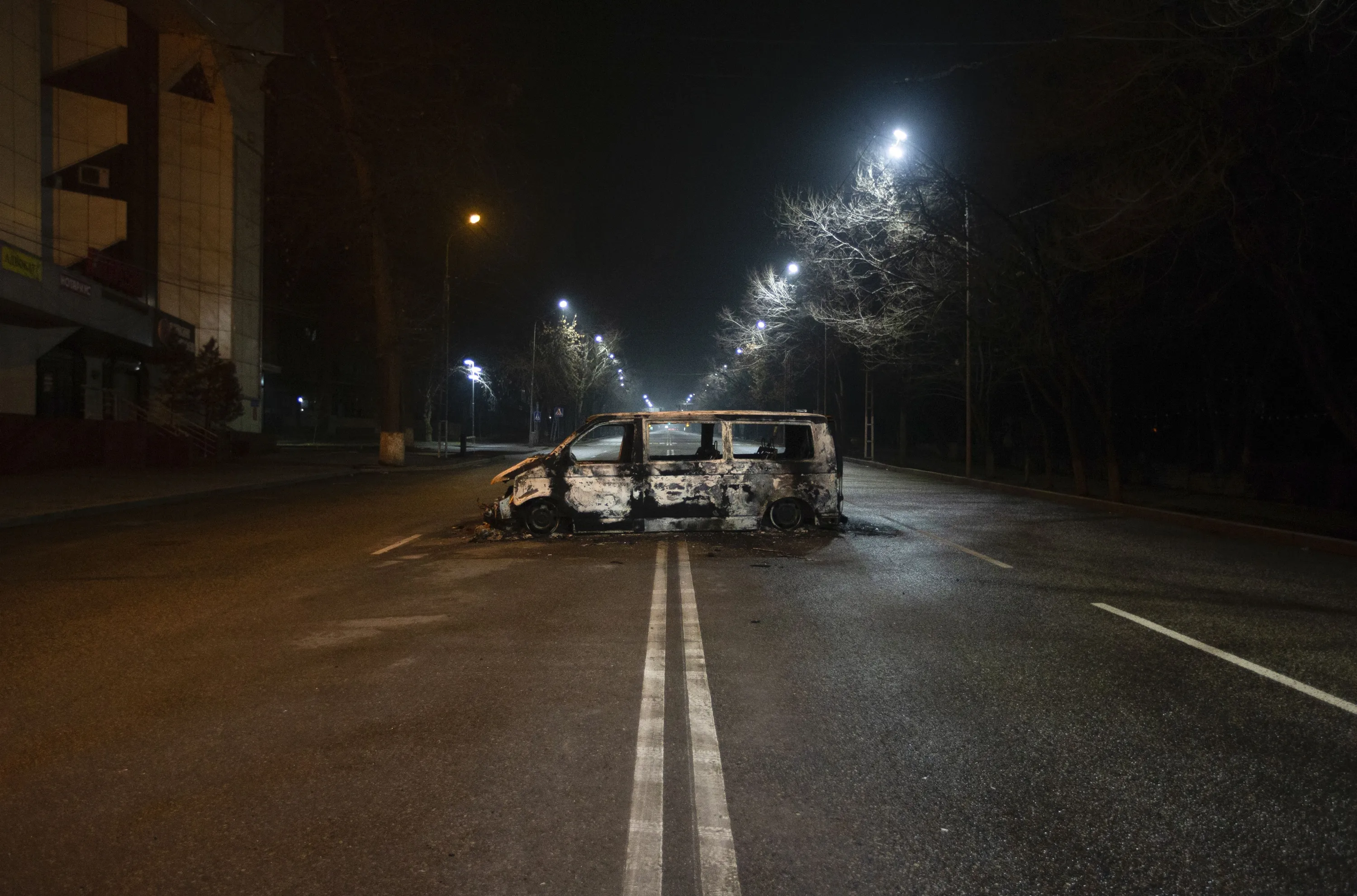 A police bus, which was burned after clashes, remains in an empty street in Almaty, Kazakhstan, late Saturday, January 8, 2022. The office of Kazakhstan's president says about 5,800 people were detained by police during protests that burst into violence last week and prompted a Russia-led military alliance to send troops to the country. (Photo by Vasily Krestyaninov/AP Photo)