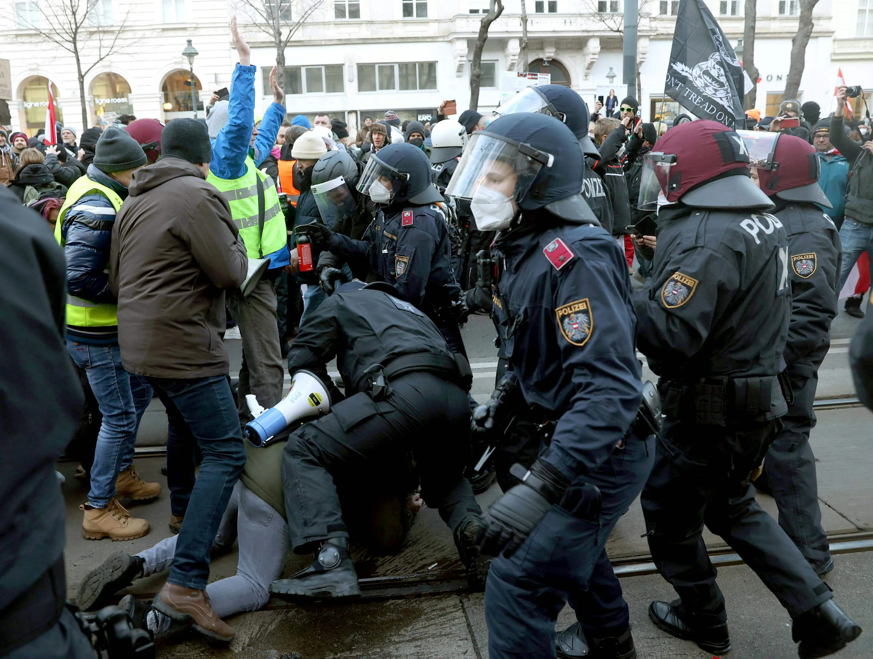 Policemen hold back people demonstrating against the Austrian government's measures taken in order to limit the spread of the coronavirus during a protest on January 8, 2022 in Vienna, amid the novel coronavirus / COVID-19 pandemic. (Photo by Florian Wieser/APA/AFP Photo)