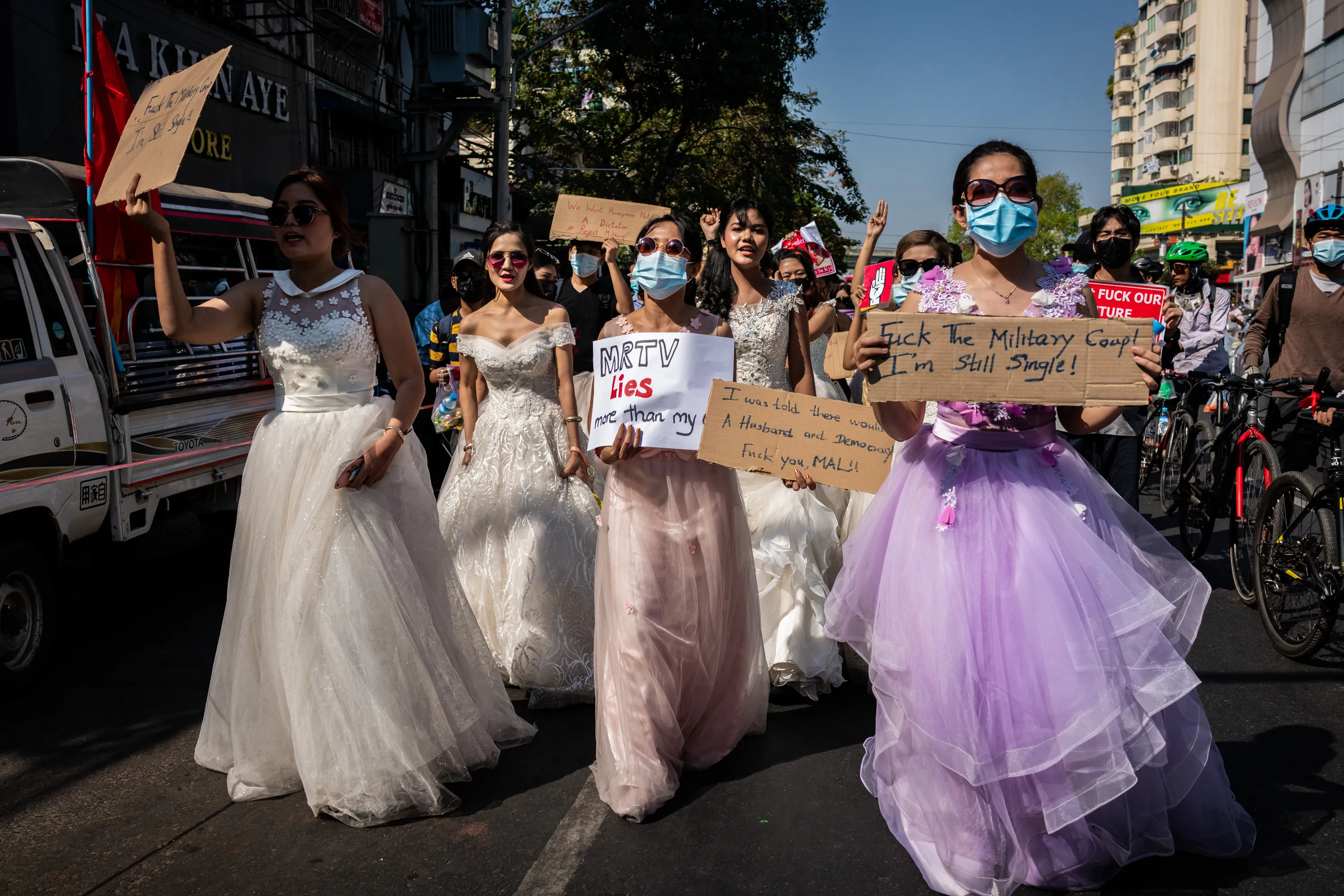 Protesters dressed in bridal costumes take part in a march against the military coup on February 10, 2021 in Yangon, Myanmar. Myanmar declared martial law in parts of the country, including its two largest cities, as massive protests continued to draw people to the streets a week after the country's military junta staged a coup against the elected National League For Democracy (NLD) government and detained de-facto leader Aung San Suu Kyi. Police fired rubber bullets, tear gas, and water cannon to disperse protesters at demonstrations across the country, and at least two people were in critical condition from the injuries sustained. (Photo by Hkun Lat/Getty Images)