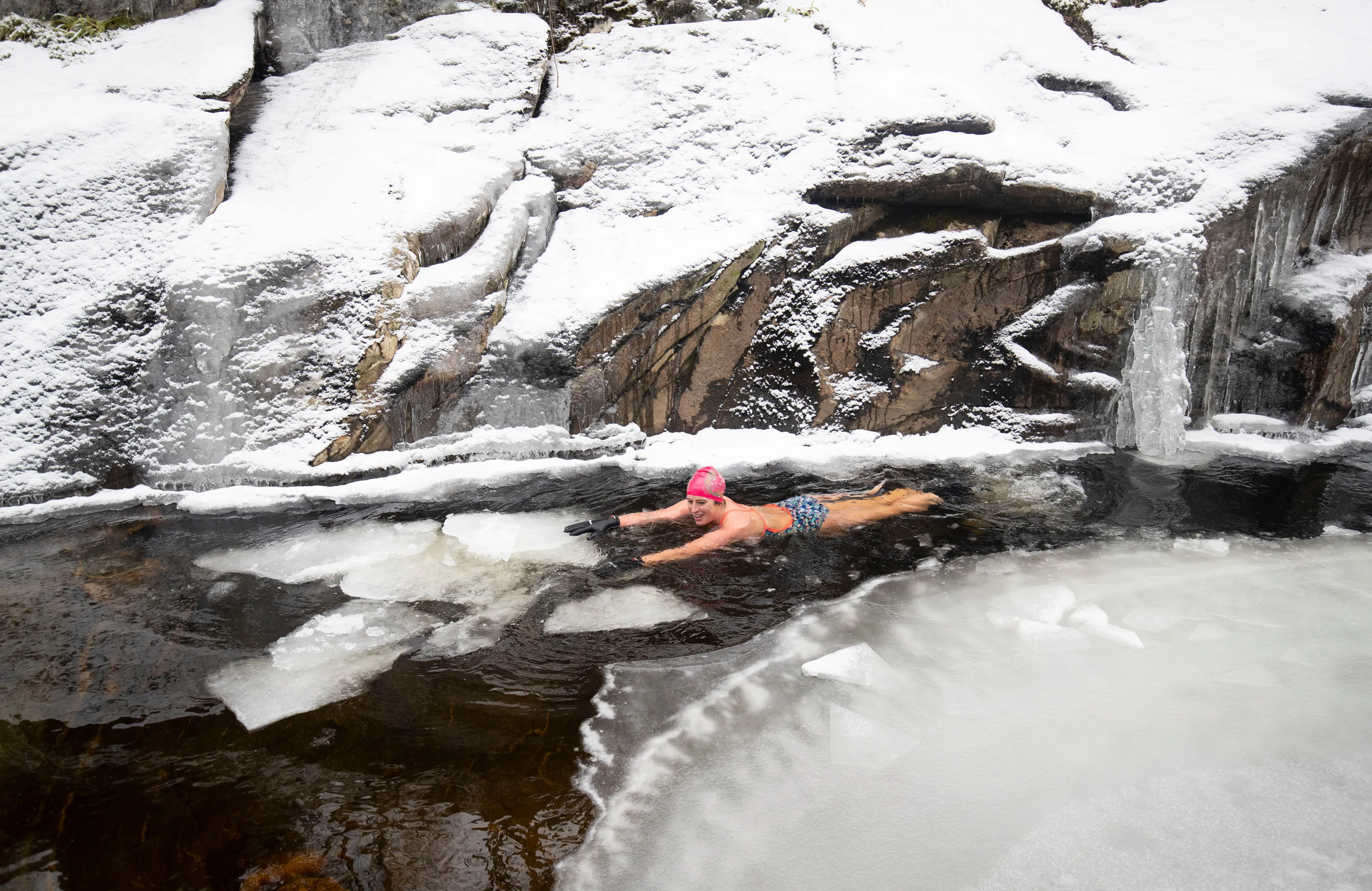 Alice Goodridge, from Newtonmore, swims the frozen waters of the River Calder in Glen Banchor in the Cairngorms National Park, United Kingdom on Thursday February 4, 2021. (Photo by Jane Barlow/PA Images via Getty Images)
