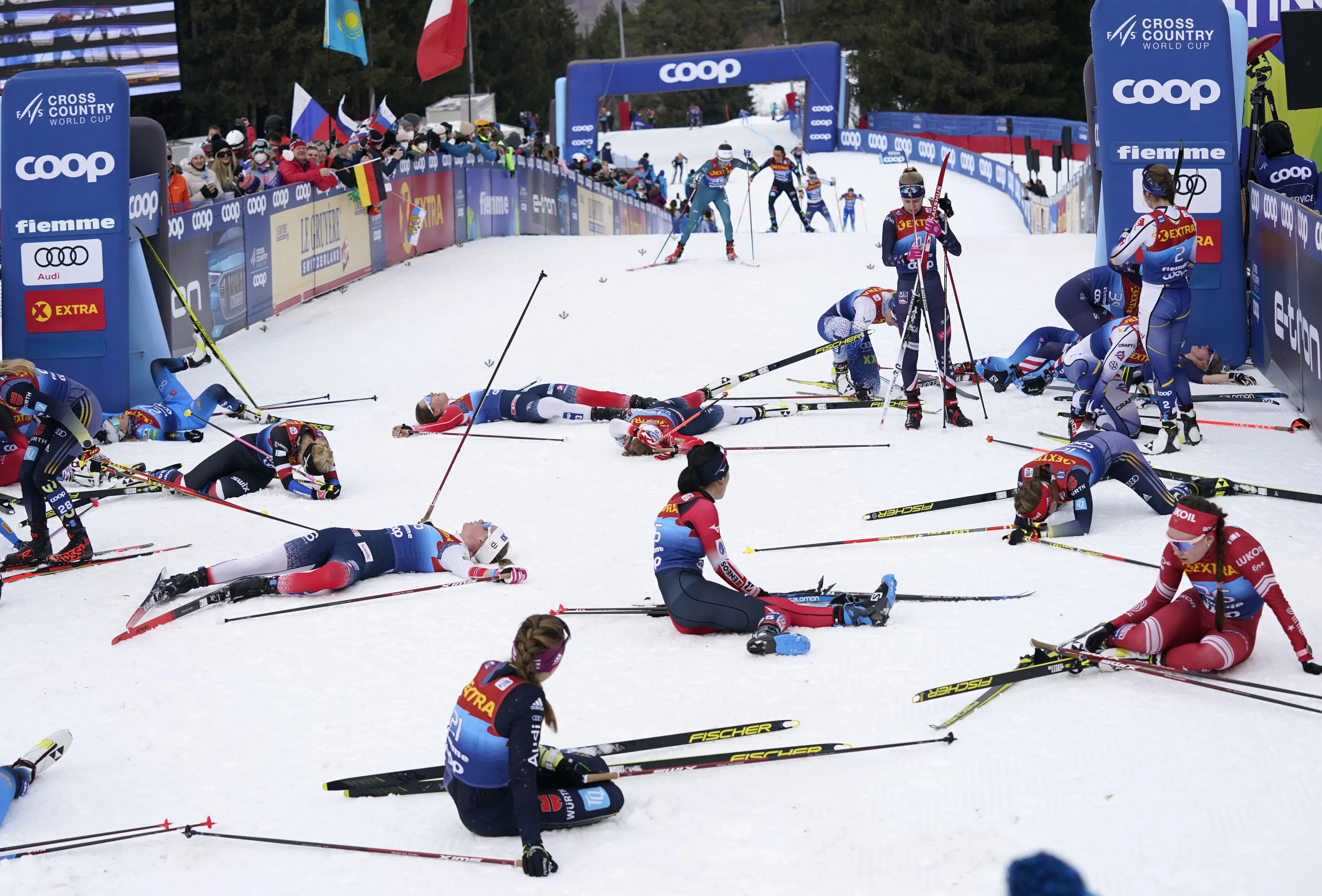 Participants recover at the finish line during the Women's Mass Start Free 10km event at the Tour de Ski in Val di Fiemme, Trento, Italy, Tuesday, January 4, 2022. (Photo by Giovanni Auletta/AP Photo)