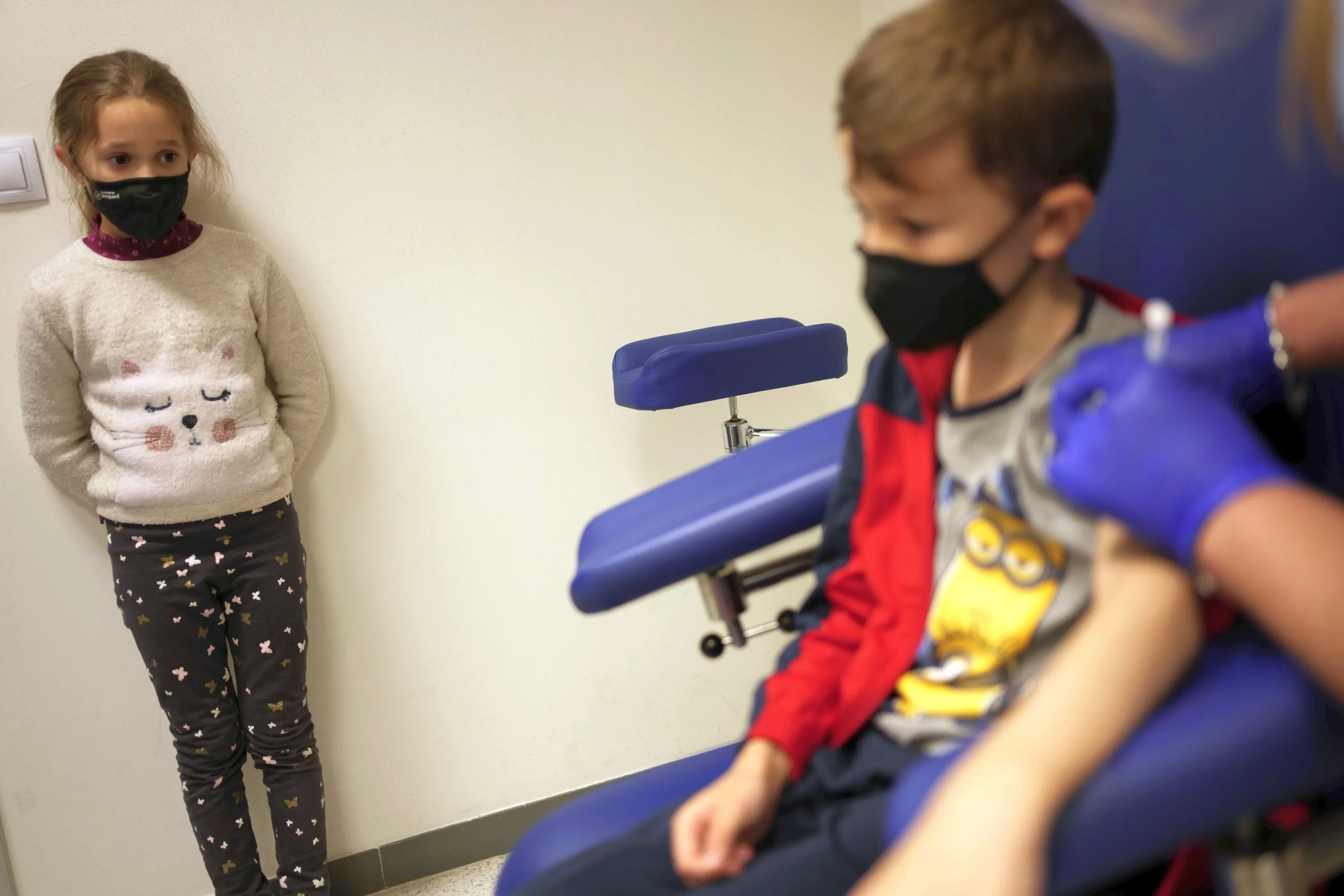 A young girl watches as a boy receives a vaccine as children are administered the first shot of the Pfizer COVID-19 vaccine at Hospital de Henares in Coslada, Madrid, Wednesday, December 15, 2022. Starting from Wednesday, Spain is trying to begin a speedy vaccination rollout for around 3.3 million children aged 5-11, the group that is leading contagion rates in the country and largely believed to be spreading new infections to their parents and grandparents. (Photo by Bernat Armangue/AP Photo)