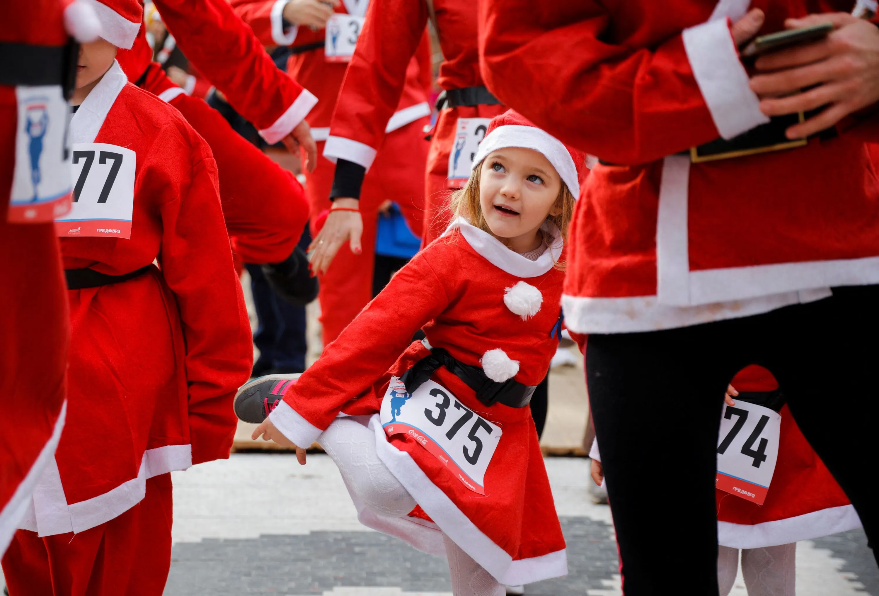 A kid dressed as Santa Claus dances along with others during the annual Santa race competition in Skopje, North Macedonia, December 26, 2021. (Photo by Ognen Teofilovski/Reuters)