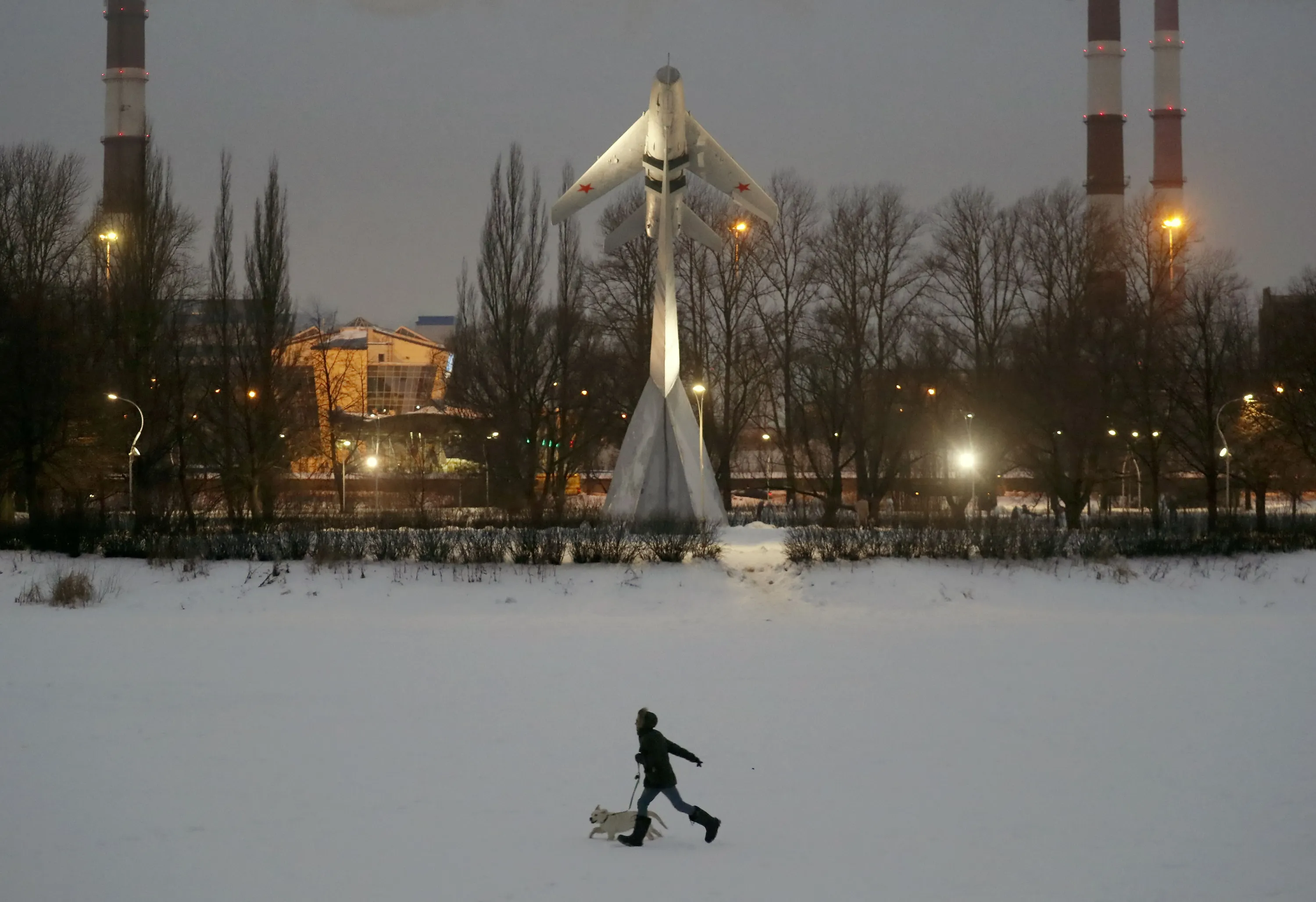 A woman runs with a dog in front of a MiG-19 fighter plane, a monument to military pilots in Aviators Park in St. Petersburg, Russia, 05 January 2022. Russians celebrate the Christmas which is observed on 07 January according to the Russian Orthodox Julian calendar, 13 days after Christmas on 25 December on the Gregorian calendar. (Photo by Anatoly Maltsev/EPA/EFE)
