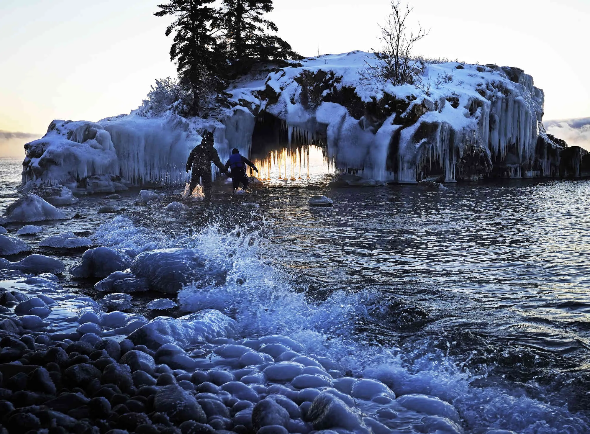 Brian T. Johnson, left, and Martin Ramirez wade into frigid Lake Superior to photograph Hollow Rock, a natural arch and island, at dawn Sunday, January 2, 2022, in Grand Portage, Minn. (Photo by David Joles/Star Tribune via AP Photo)