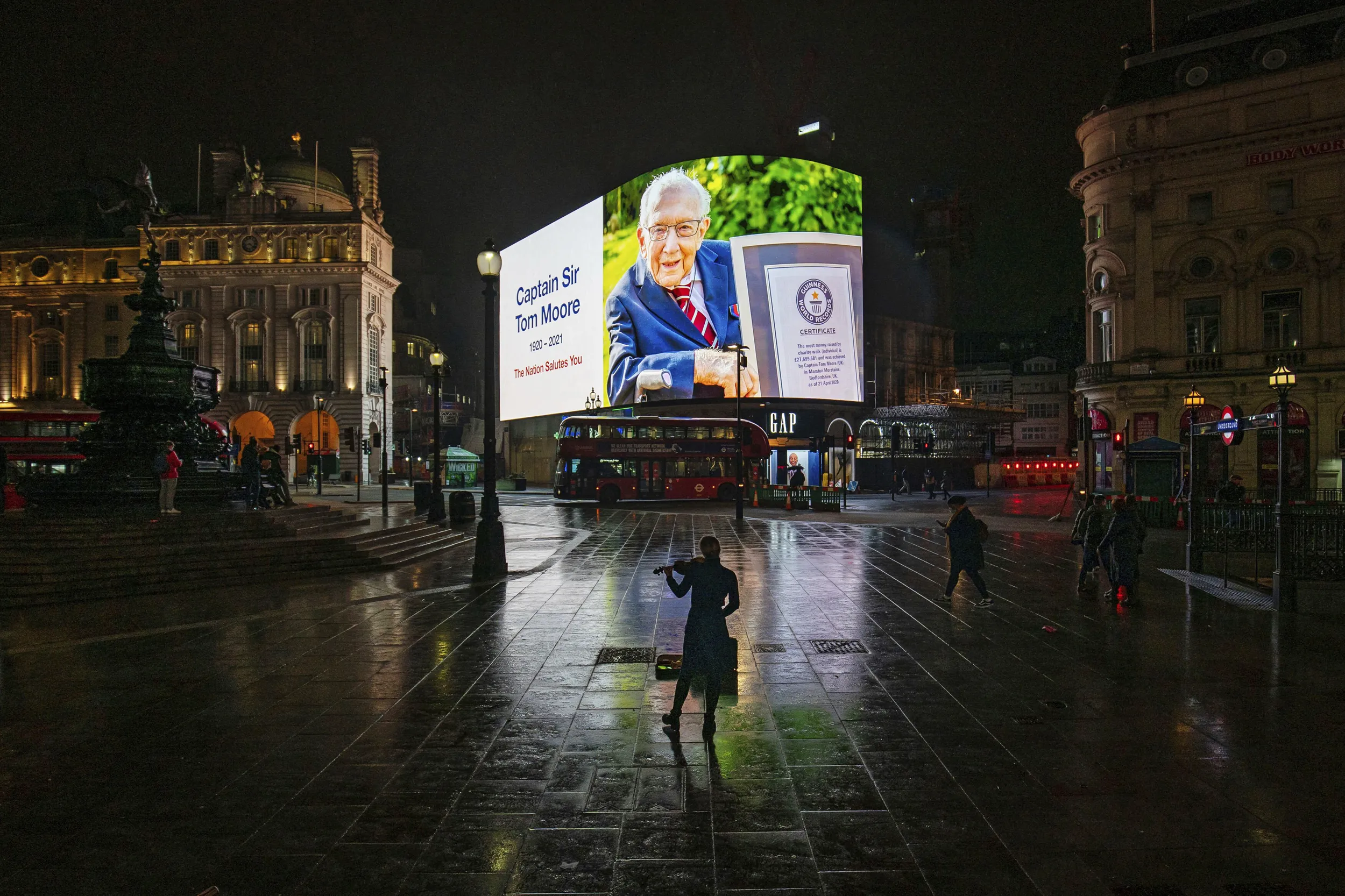 A woman plays the violin as a tribute to Captain Sir Tom Moore is displayed in Piccadilly Circus, London, Tuesday, February 2, 2021. The British World War II veteran who walked into the hearts of a nation in lockdown as he shuffled up and down his garden to raise money for health care workers has died after testing positive for COVID-19. Capt. Tom Moore was 100-years-old. (Photo by Aaron Chown/PA via AP Photo)