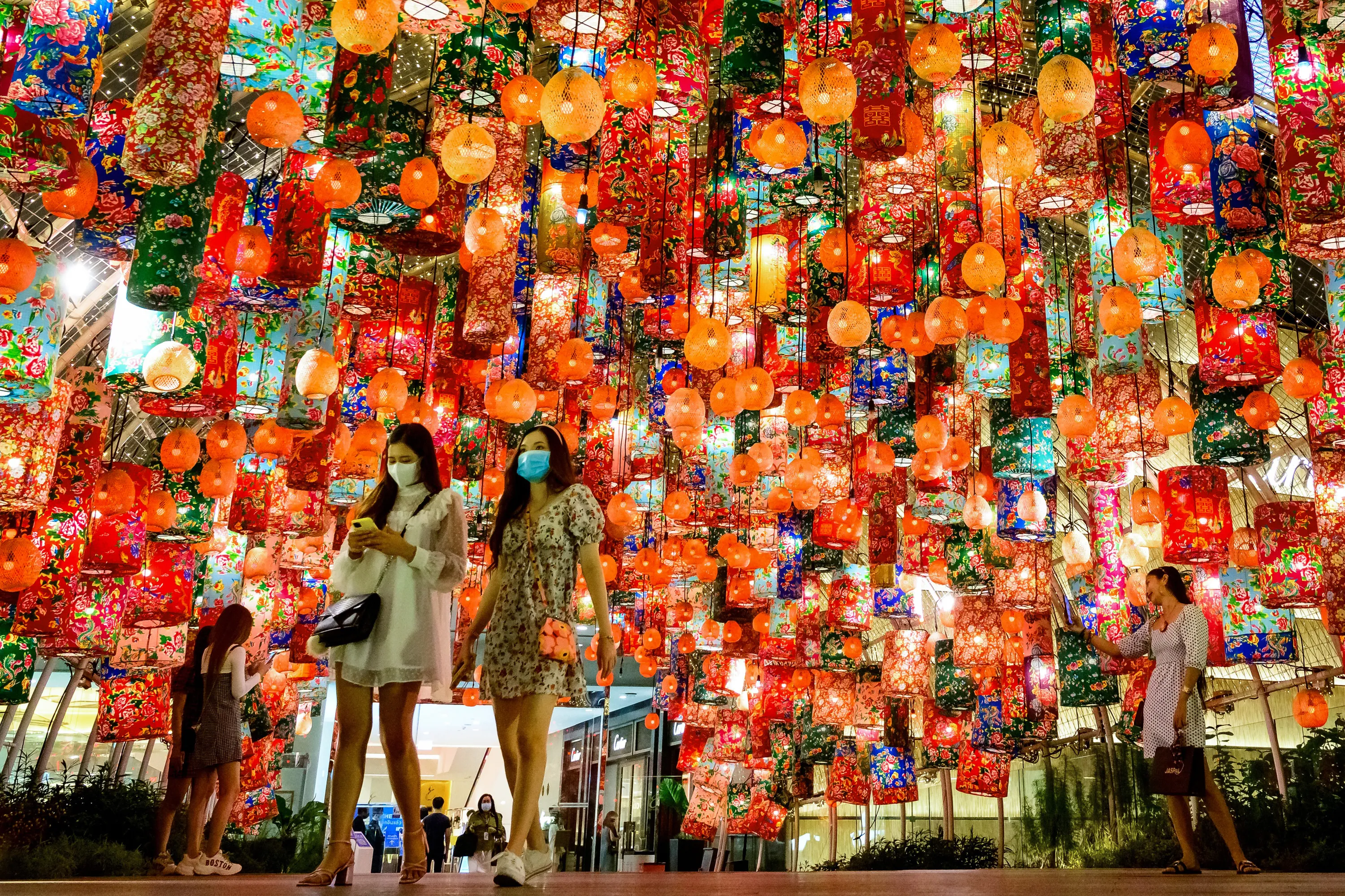 People walk under festive decorations for the upcoming Lunar New Year outside a shopping mall in Bangkok on February 3, 2021. (Photo by Mladen Antonov/AFP Photo)