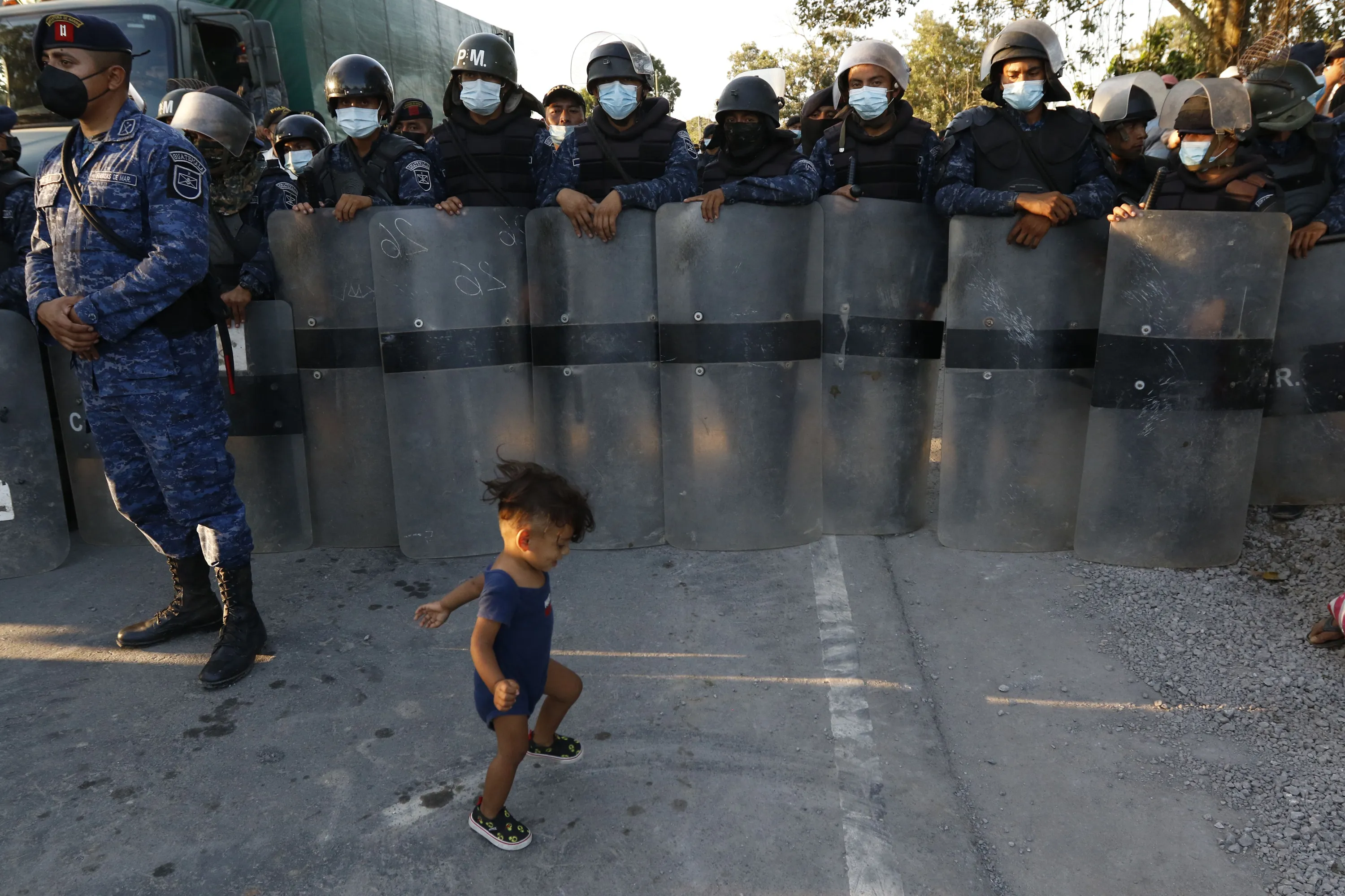 Guatemala's military lines to stop migrants who are part of a caravan from Honduras hoping to reach the United States, after they crossed the border in Puerto Barrios, Guatemala, Saturday, January 15, 2022. (Photo by Delmer Martinez/AP Photo)