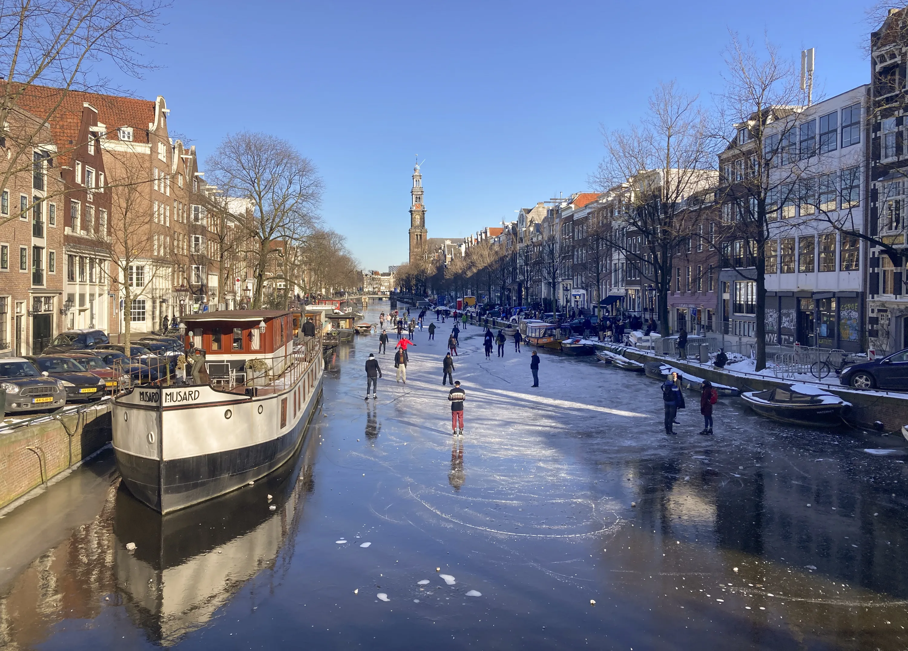 Dozens of skaters took to the frozen surface of Amsterdam's historic Prinsengracht canal in Amsterdam, Netherlands, Saturday, February 13, 2021, as the deep freeze gripping Europe briefly made it possible to skate on a small section of the canal for the first time since 2018. People skated and walked on a small stretch of ice between two bridges close to the landmark Westerkerk before growing cracks in the ice forced all but the most daring off the ice. in Amsterdam, Netherlands, Saturday, Feb. 13, 2021. (Photo by Mike Corder/AP Photo)