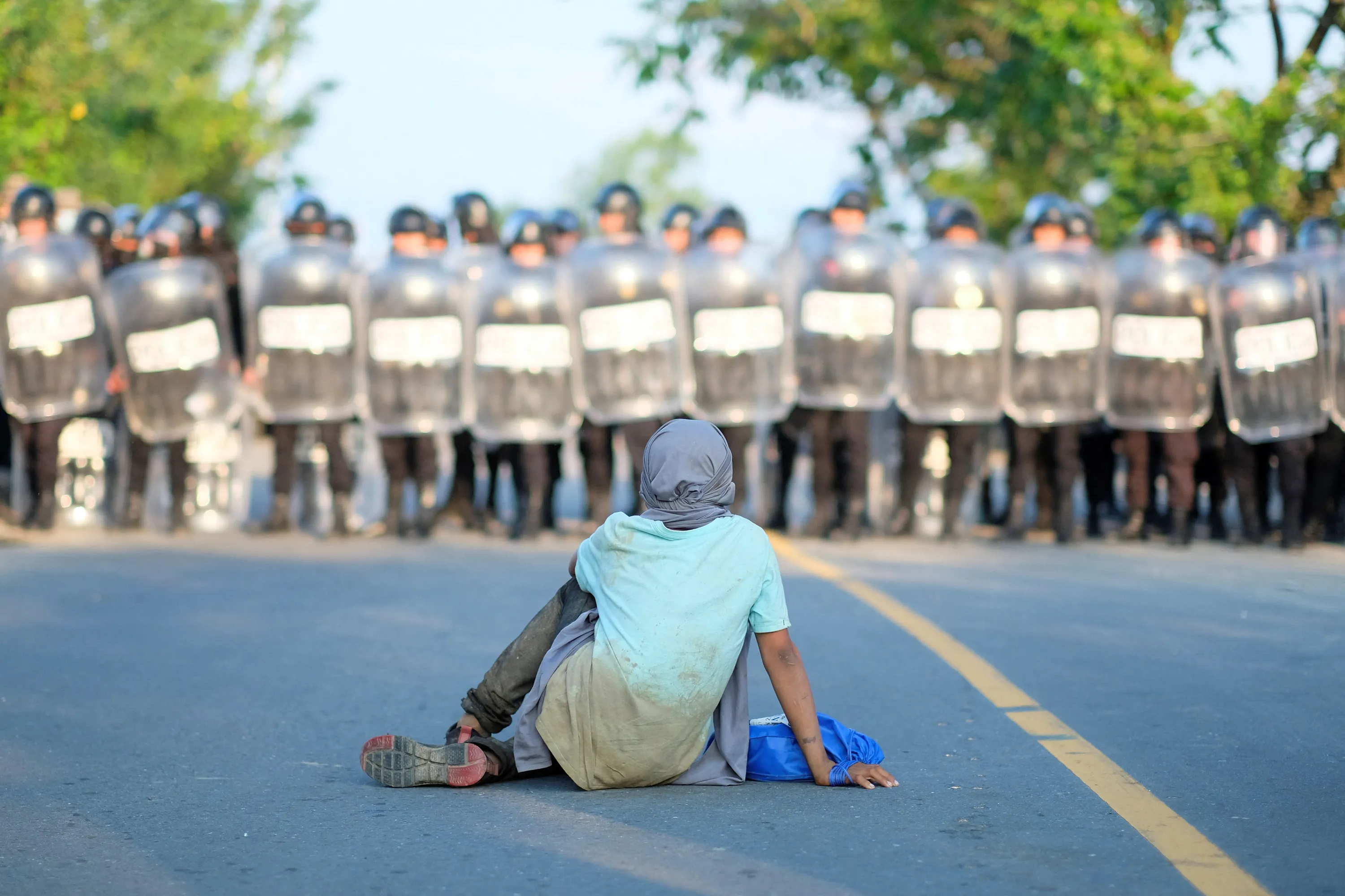 A migrant from Central America sits on a road in front of a Guatemalan police officers after a migrant caravan was blocked by Guatemalan authorities, near the border with Honduras outside of Puerto Barrios, Guatemala, January 16, 2022. (Photo by Josue Decavele/Reuters)