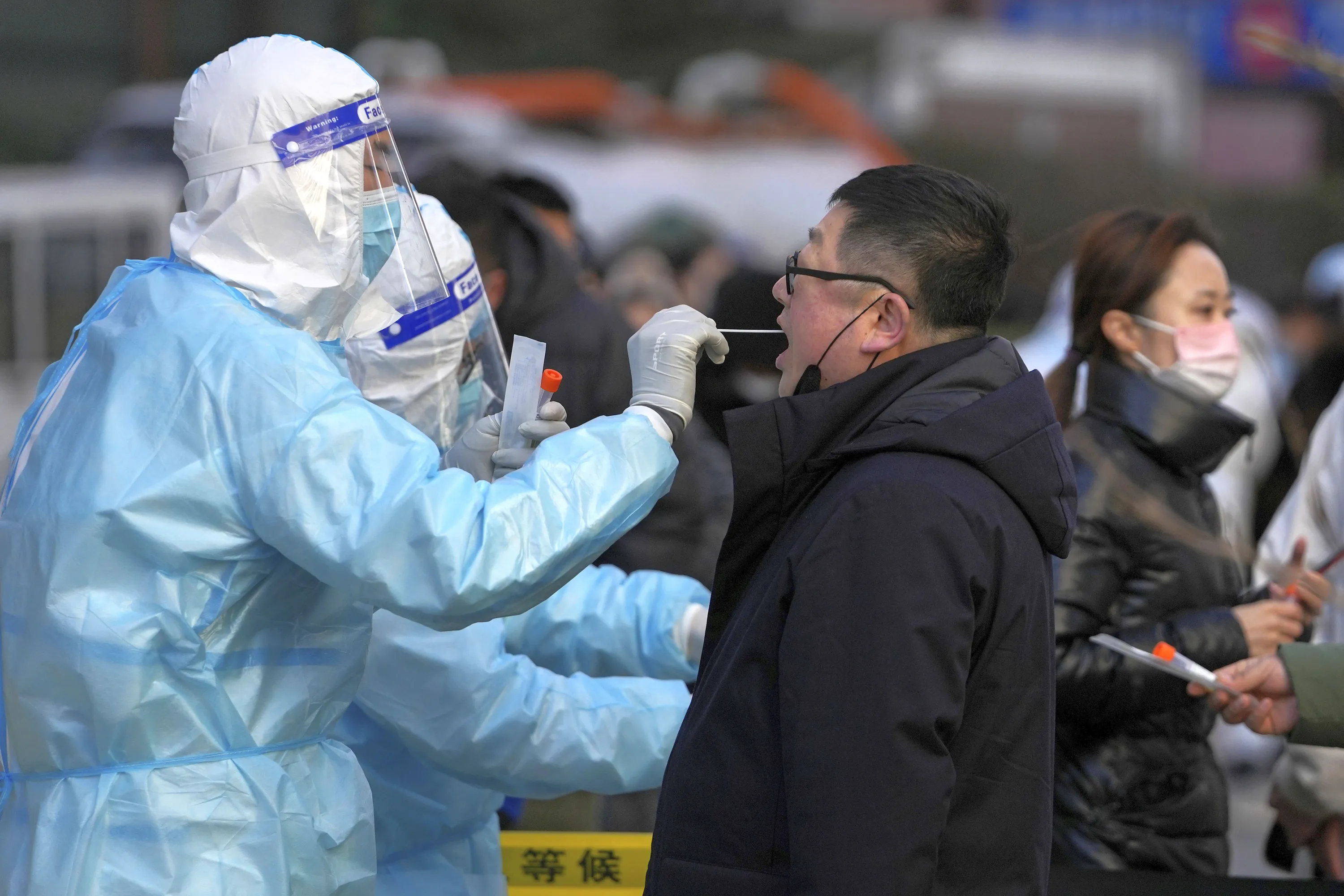 A man gets a throat swab for the COVID-19 test at a mobile coronavirus testing facility outside a commercial office buildings in Beijing, Monday, January 17, 2022. Beijing's first reported case of the omicron variant has prompted stepped-up measures in the nation's capital, just weeks before it hosts the Winter Olympic Games. (Photo by Andy Wong/AP Photo)
