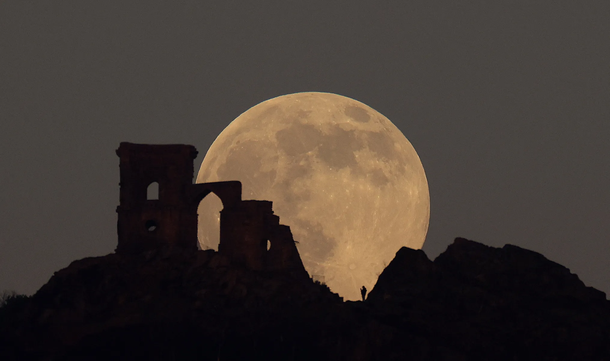 The Wolf Moon rises over Mow Cop Folly, Mow Cop, Britain, January 17, 2022. (Photo by Carl Recine/Reuters)